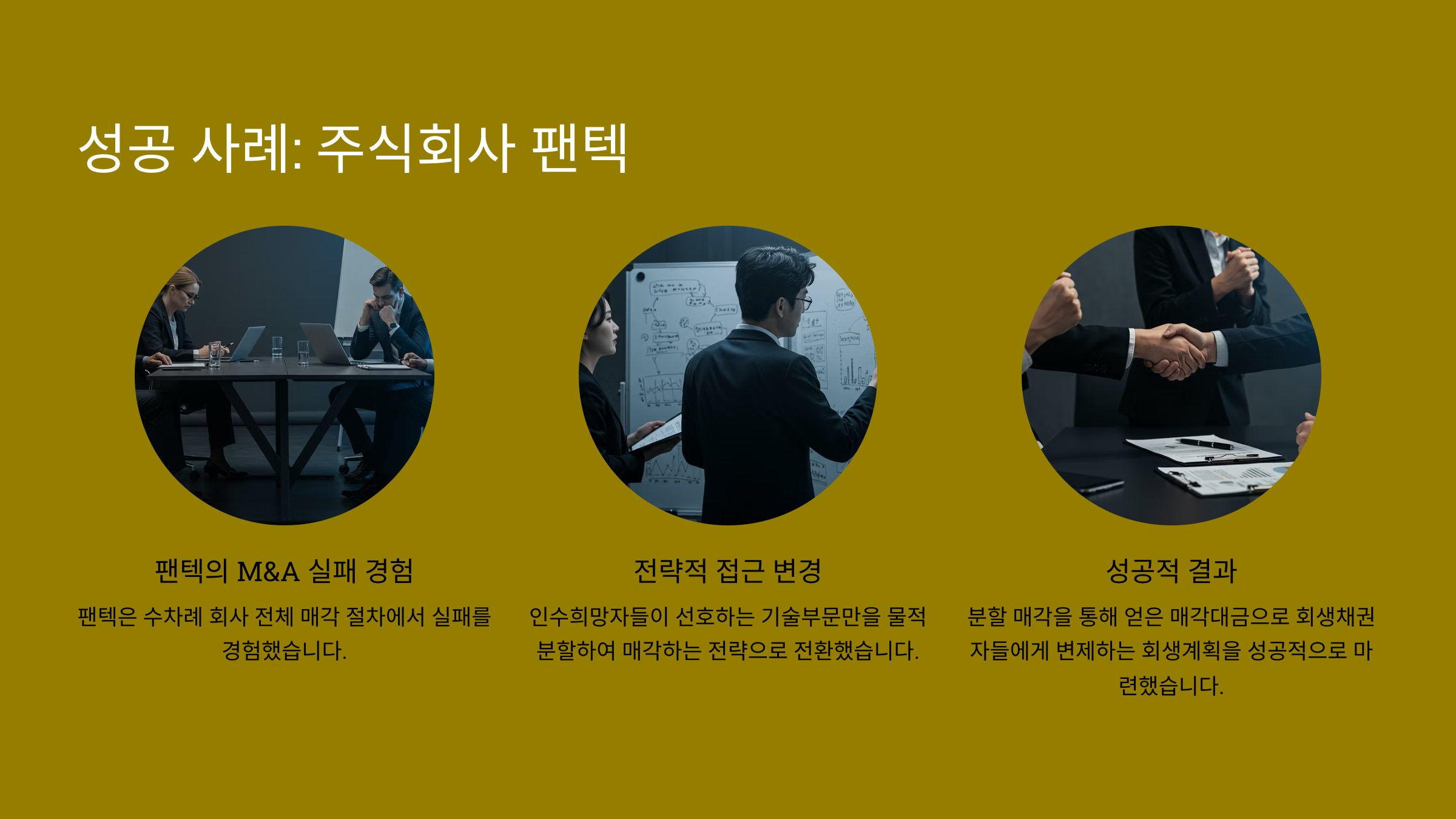 예컨대 주식회사 팬텍의 경우 수차례 매각절차에서 실패한 후 인수희망자들이 선호하는 기술부문만을 물적 분할하여 매각하고, 동 매각대금으로 회생채권자들에게 변제하는 방법으로 회생계획을 마련한 사례가 있다.