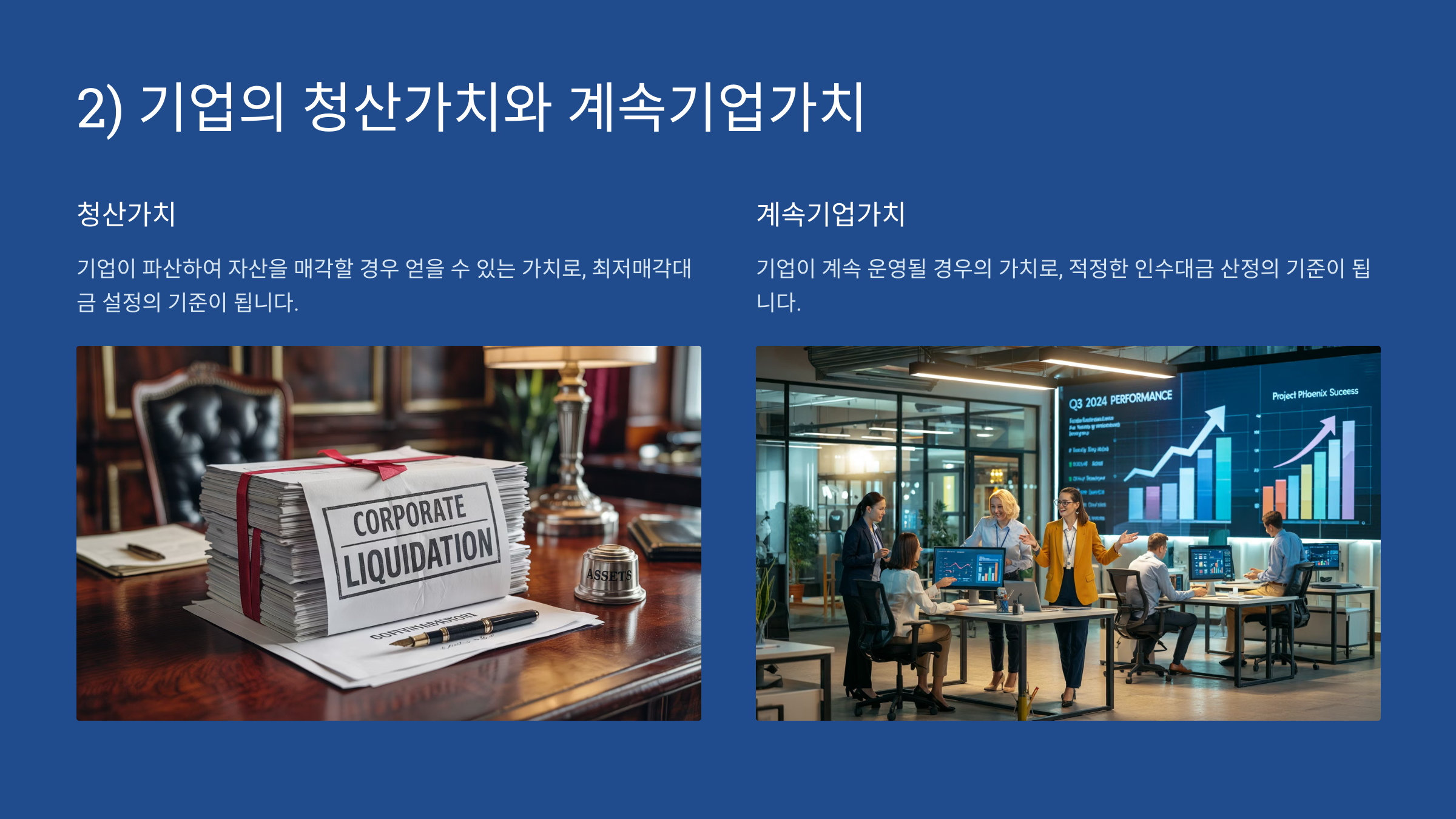 매각주간사 실사에 따라 산정된 '청산가치'와 '계속기업가치'는 '최저매각대금'과 '적정한 인수대금'을 정하는 일응의 기준이 되며, 실사로 파악한 회사의 현황과 재무구조 등을 바탕으로 매각주간사, 관리인 등은 매각가능성 및 관계인집회에서의 채권자들의 동의가능성을 높이는 구체적인 매각전략을 수립할 수 있다.