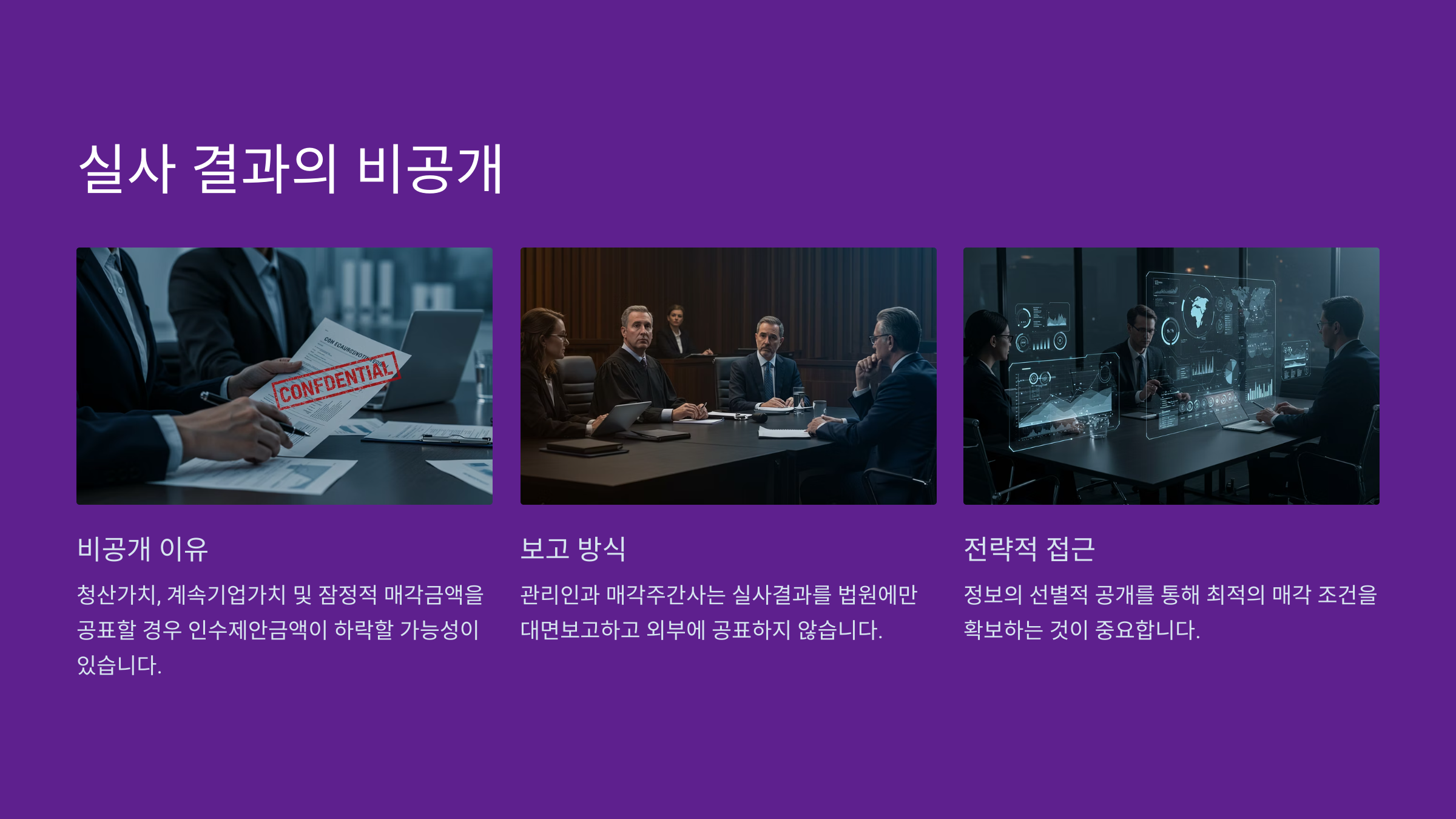 다만 청산가치, 계속기업가치 및 이를 바탕으로 한 잠정적인 매각금액을 공표할 경우 '인수제안금액'이 하락할 가능성이 있으므로, 관리인과 매각주간사는 실사결과를 법원에 대면보고 할 뿐 이를 공표하지 않는다.