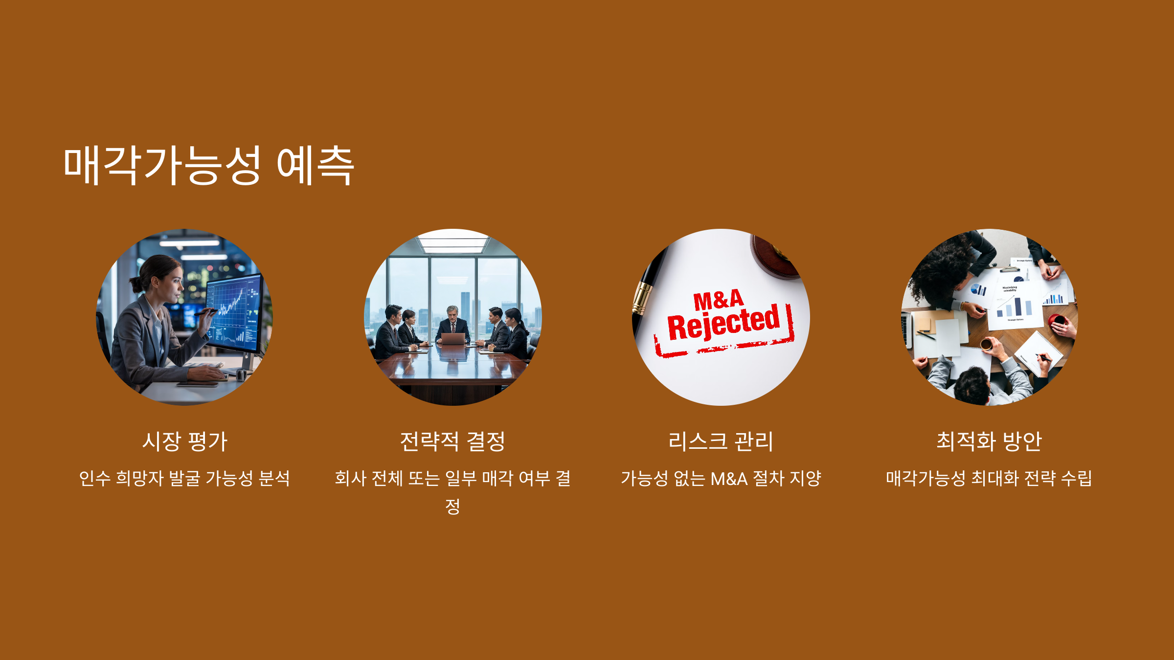 M&A전략에서 가장 중요한 것은 매각가능성의 예상이다. 때로 가능성이 없는 M&A절차를 강행하는 것은 실패시 매각가액만 낮추는 결과가 될 수 있으므로 주의하여야 하며, 매각방식도 회사 전체를 매각할 것인지 일부만을 매각할 것인지 미리 결정하여 매각가능성을 최대한 높이도록 한다.