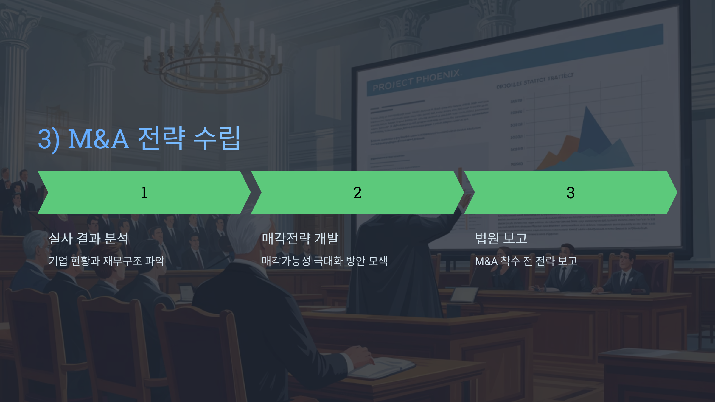관리인과 매각주간사는 M&A 착수 전에 실사결과에 바탕한 매각전략을 수립하여 법원에 보고한다.