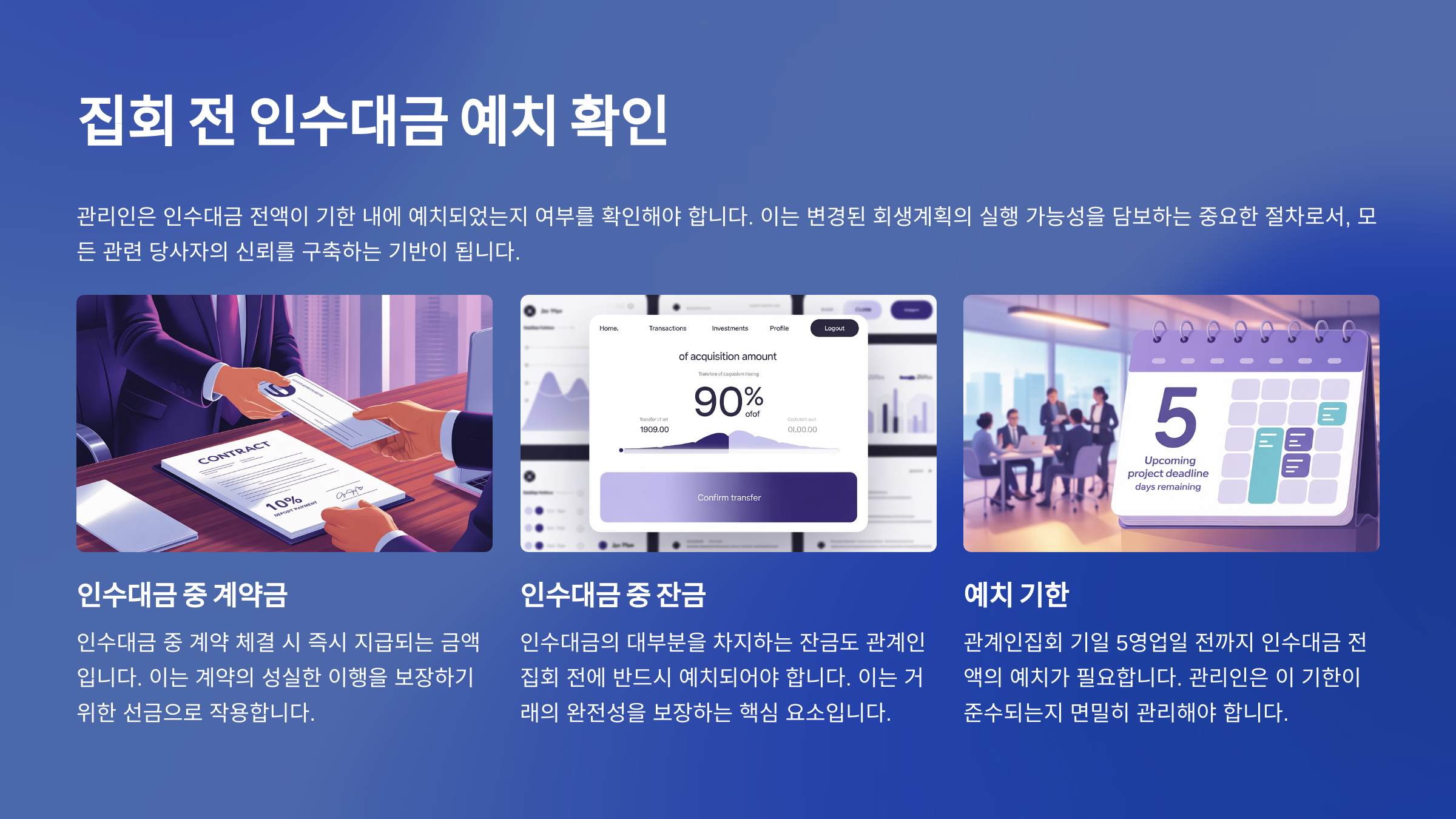 전체 인수금액에서 계약금을 제외한 나머지 인수대금이 변경회생계획안의 심리 및 결의를 위한 관계인집회 기일 5영업일 전까지 전액 예치되어야 하므로, 관리인은 사전에 예치될 가능성을 점검하고, 기한 내에 예치되었는지 여부를 확인하여야 한다.