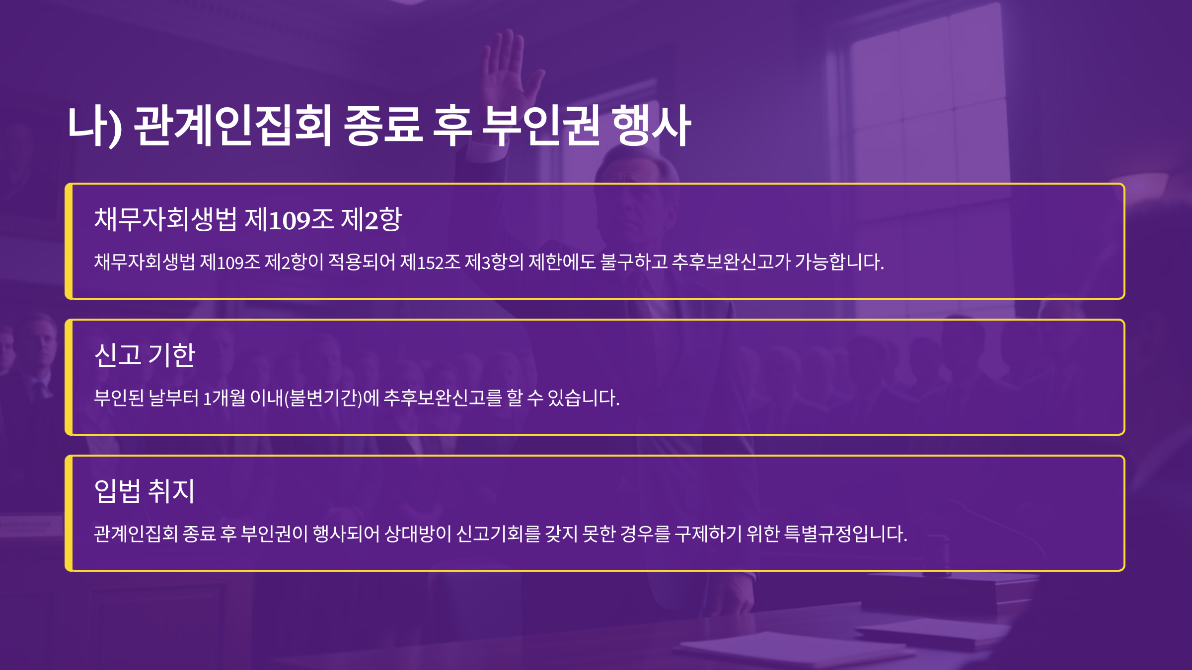 ㉡반면 <관계인집회 종료 후 부인권이 행사>되어 상대방의 채권이 부활한 경우에는 채무자회생법 제109조 제2항이 적용되어, 제152조 제3항의 제한에도 불구하고 부인된 날부터 1개월 이내(불변기간)에 추후보완신고를 할 수 있다. 이는 관계인집회 종료 후 부인권이 행사되어 상대방이 신고기회를 갖지 못한 경우를 구제하기 위한 특별규정이다.