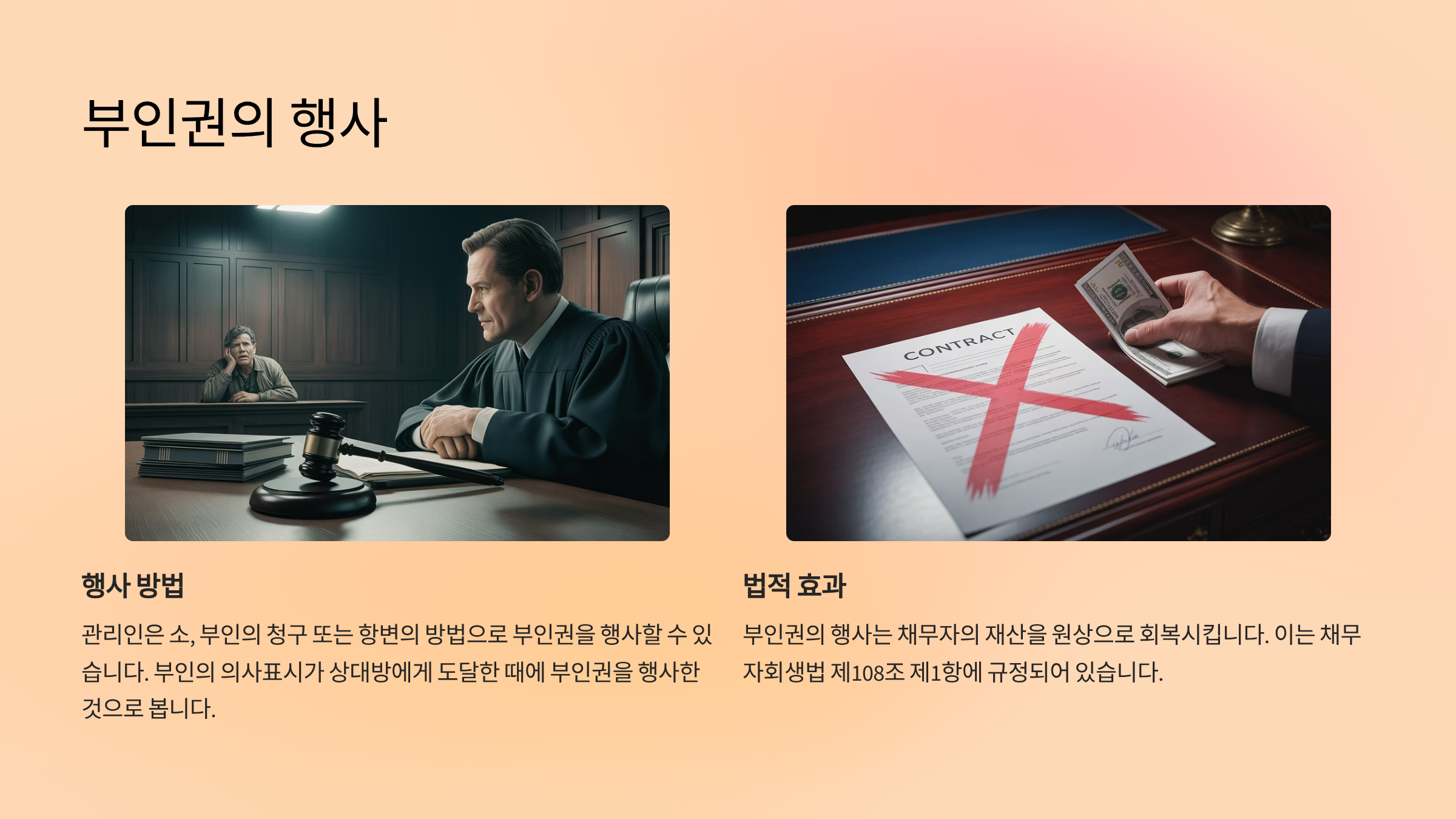 관리인은 소, 부인의 청구 또는 항변의 방법으로 부인권을 행사할 수 있으며, 부인의 의사표시가 상대방에게 도달한 때에 부인권을 행사한 것으로 본다.
