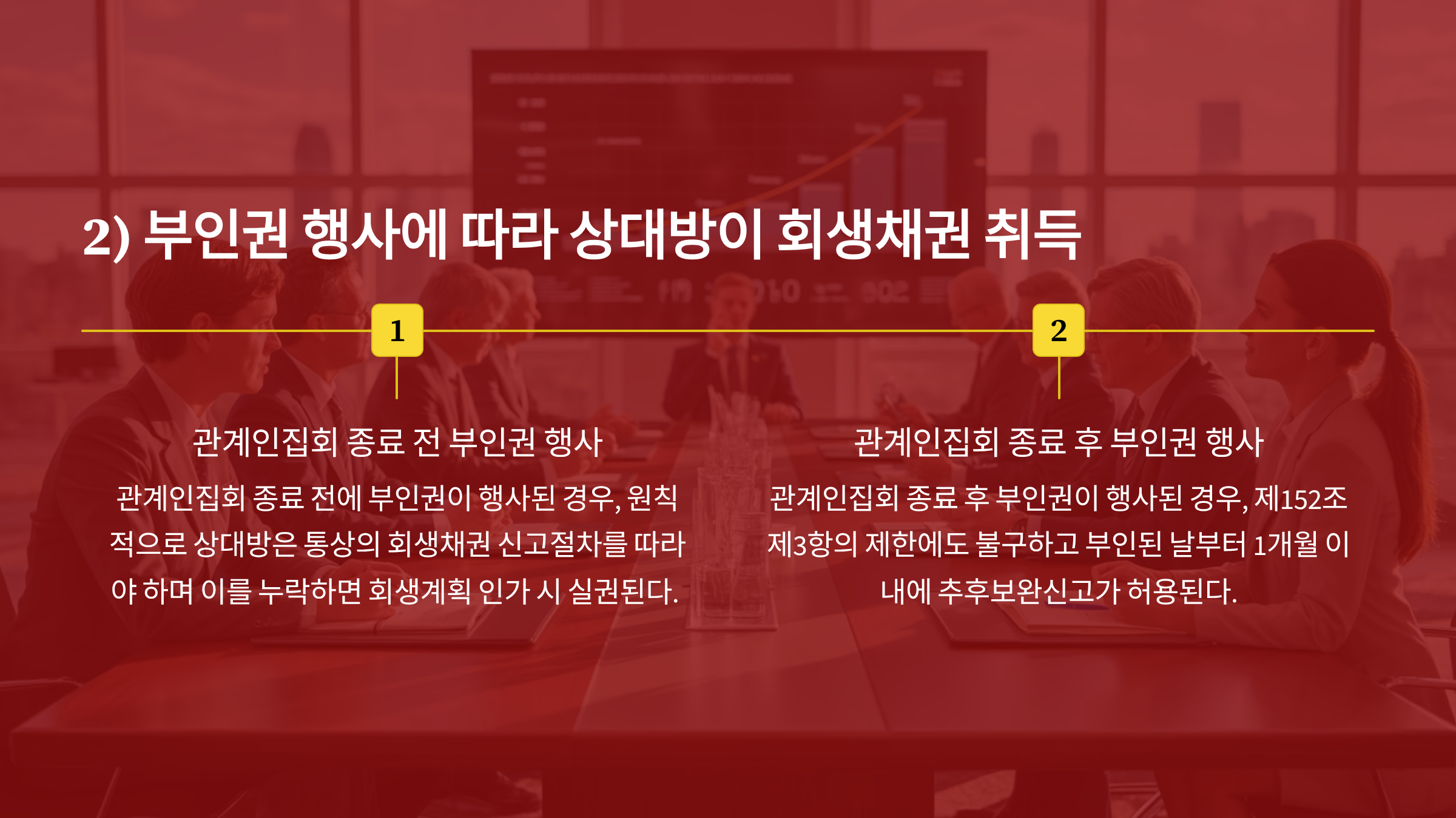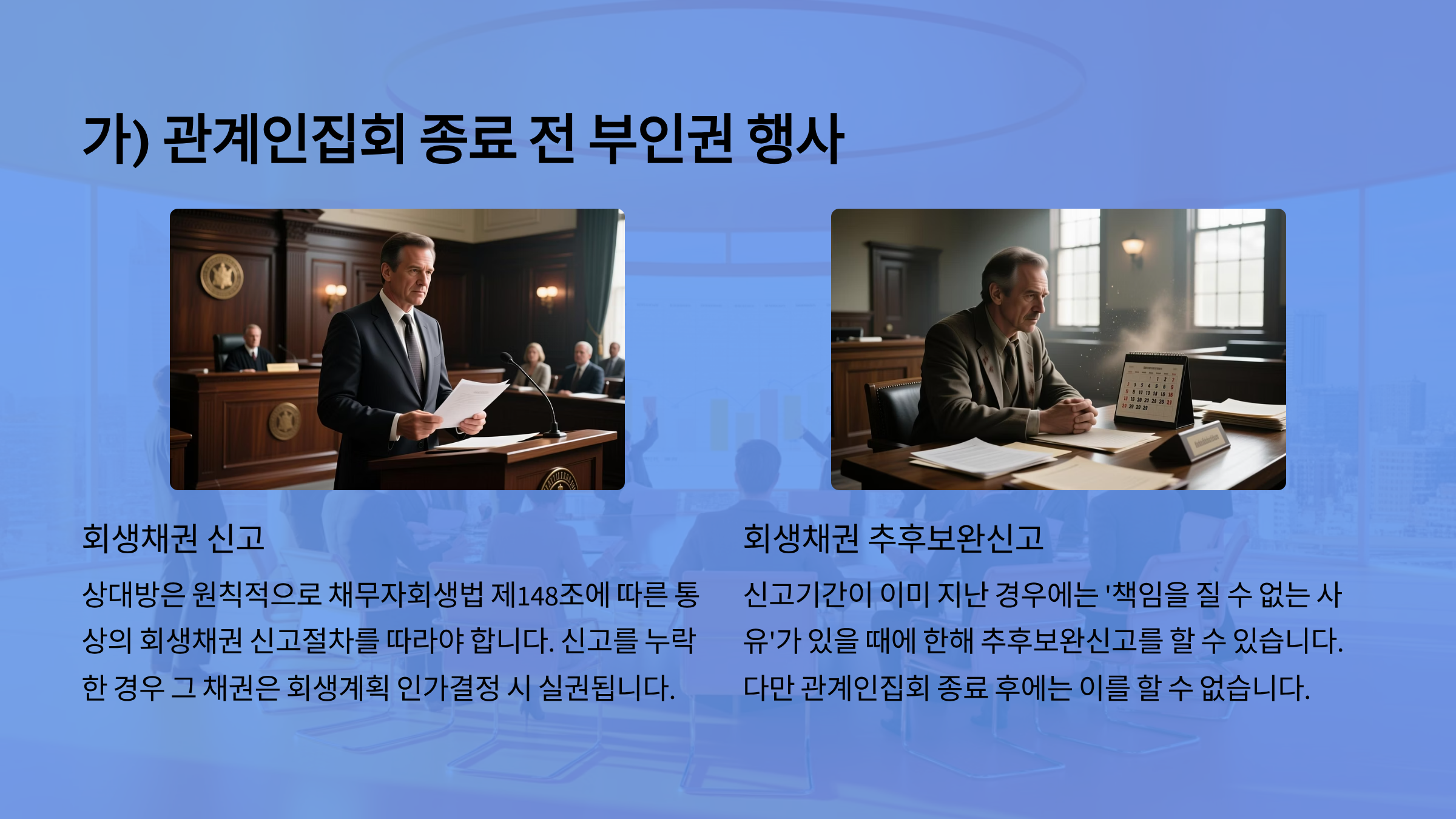 ㉠<관계인집회 종료 전에 부인권이 행사된 경우> 상대방은 원칙적으로 채무자회생법 제148조에 따른 통상의 회생채권 신고절차를 따라야 하며, 이를 누락한 경우 그 채권은 회생계획 인가결정 시 실권된다(법 제251조).