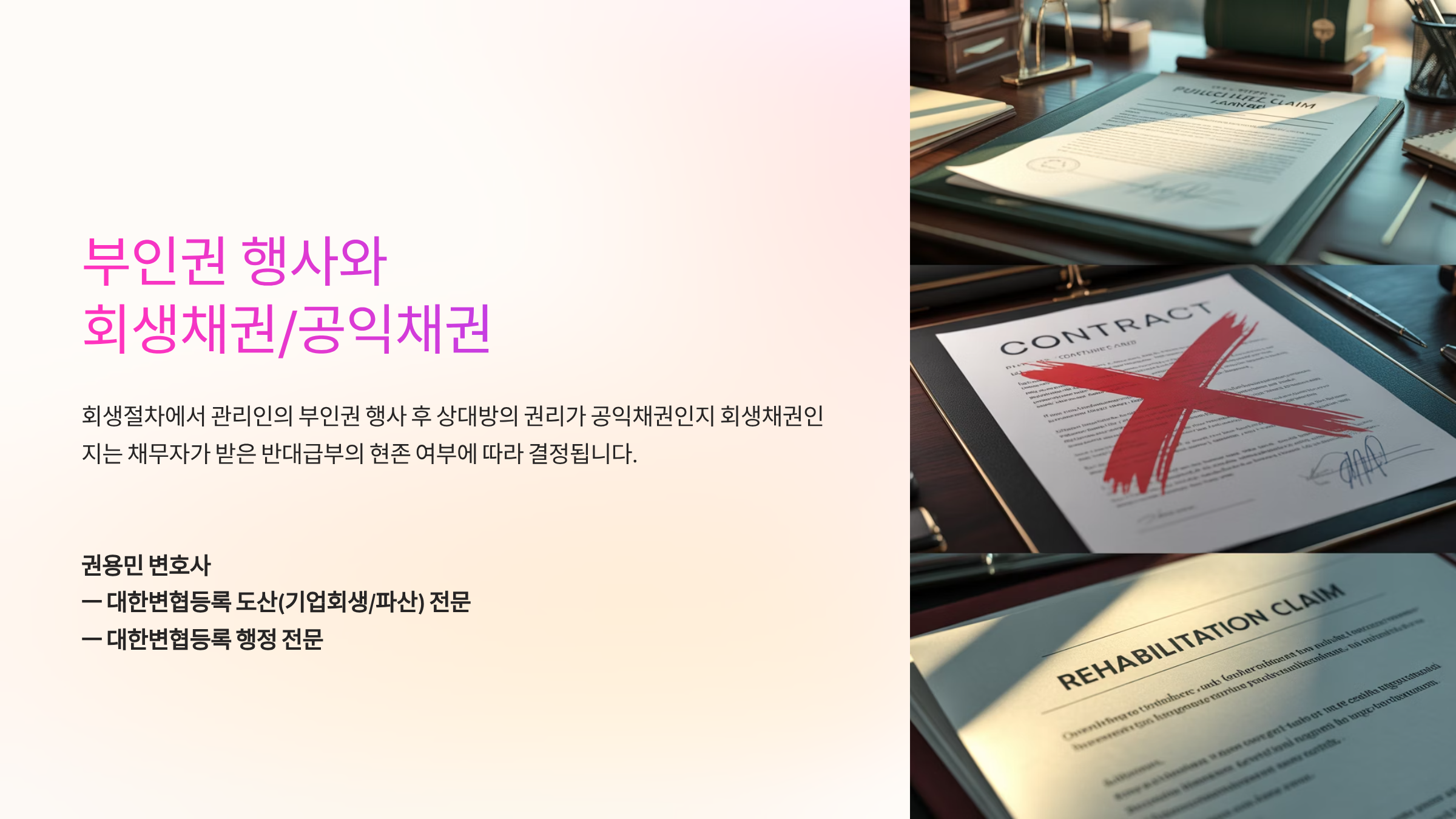 결국, 부인권 행사로 인한 권리의 성질이 공익채권인 경우에는 회생절차와 무관하게 즉시 변제받을 수 있으나, 회생채권인 경우에는 원칙적으로 신고와 확정 절차를 거쳐 회생계획에 따른 변제를 받아야 한다.