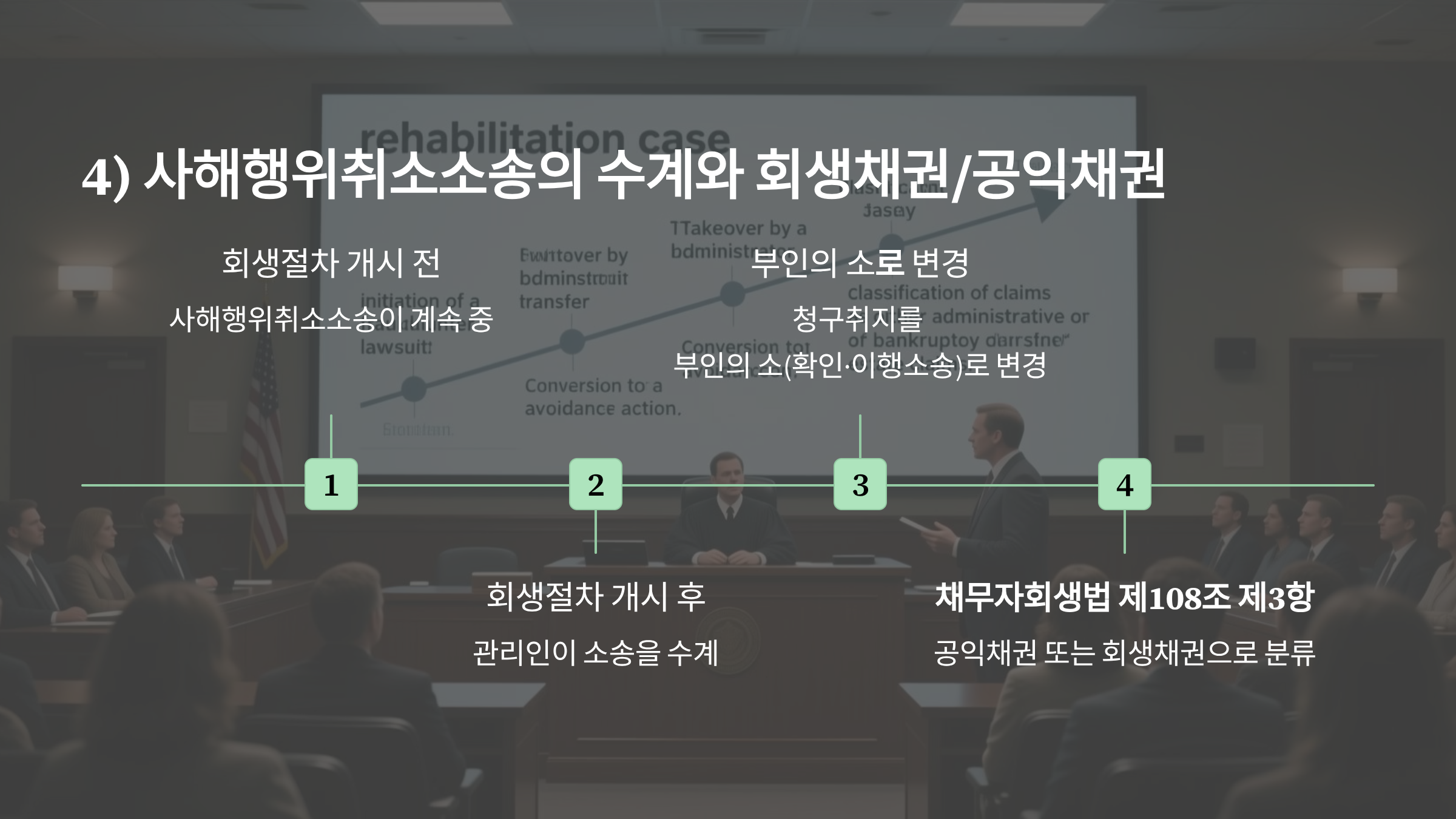 관리인은 사해행위취소소송을 부인의 소로 청구변경해야 하며, 이를 하지 않으면 부적법하다. 상대방은 부인의 소 결과를 예상하여 회생채권으로 신고할 수 있고, 관리인이 채권자목록에 기재할 수도 있다.