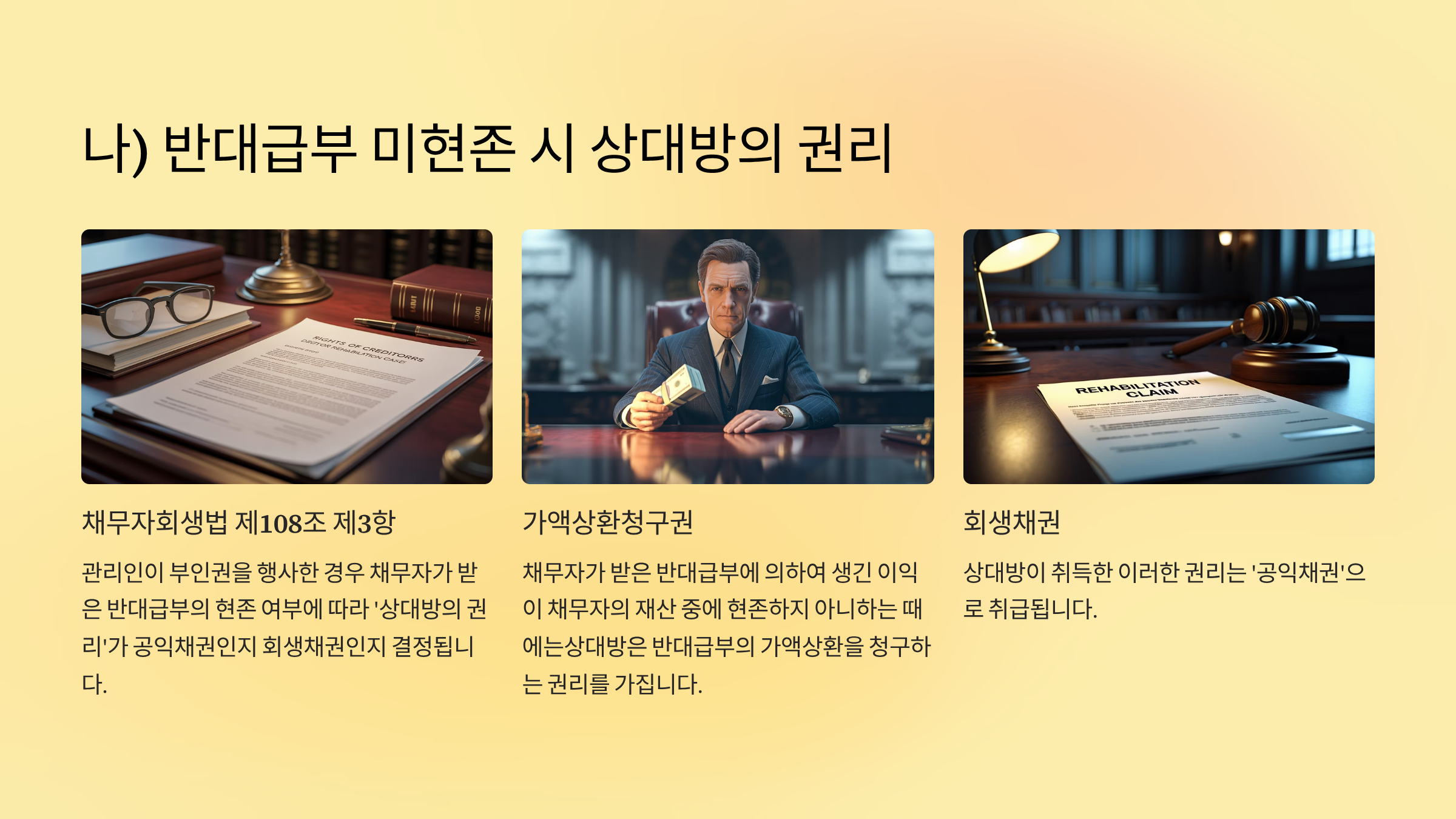 관리인이 부인권을 행사한 경우 채무자회생법 제108조 제3항에 따라, 채무자가 받은 반대급부의 현존 여부에 따라 '상대방의 권리'가 공익채권인지 회생채권인지 결정된다.