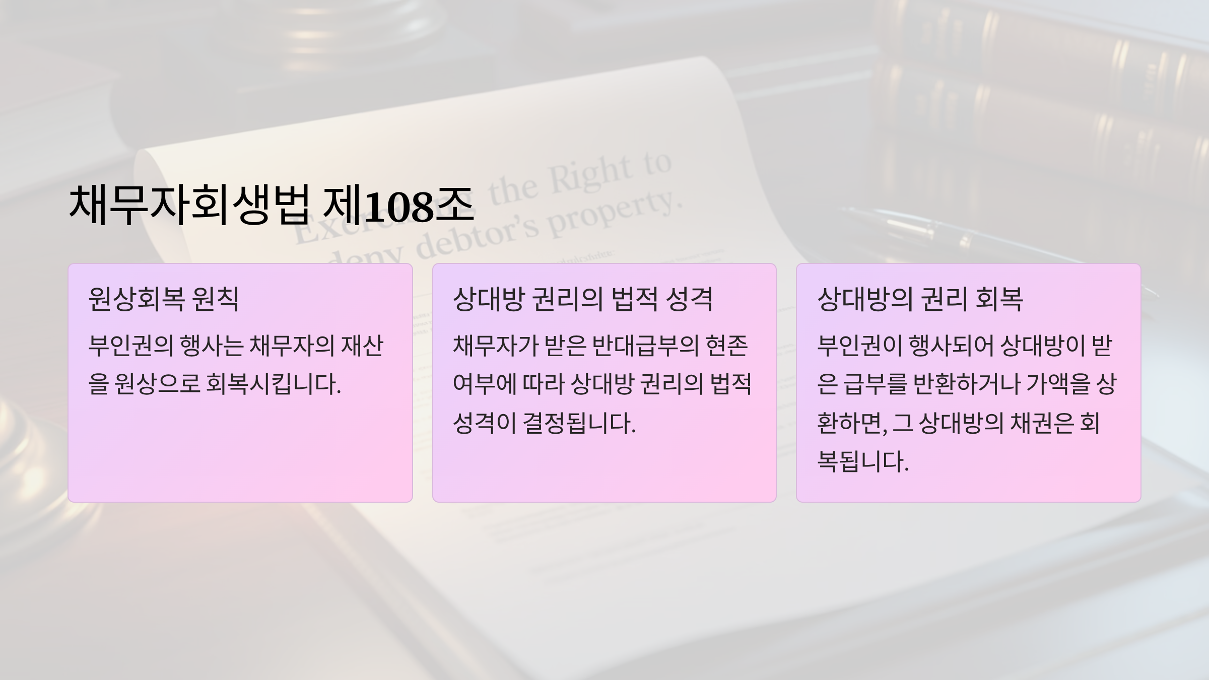 따라서 관리인이 소송을 수계하여 부인권을 행사하면, 상대방의 반대급부 채권은 부인의 소 판결에 따라 부활하고, 그 성질은 제108조 제3항에 따라 공익채권 또는 회생채권으로 구분된다. 즉, 채무자가 받은 반대급부나 그 이익이 현존하는 범위 내에서는 공익채권으로, 그렇지 않으면 회생채권으로 본다.