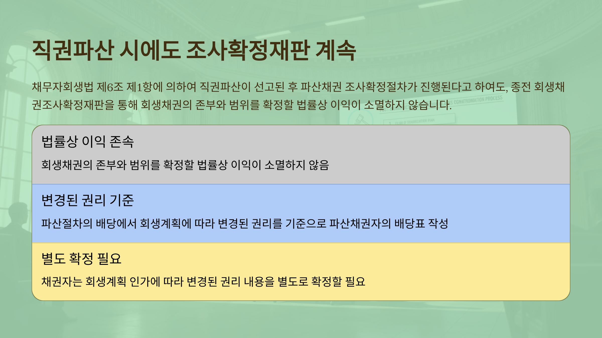 판례는 채무자회생법 제6조 제1항에 의하여 <직권파산이 선고된 후 '파산채권 조사확정절차'가 진행>된다고 하여도, 종전 회생채권조사확정재판을 통해 회생채권의 존부와 범위를 확정할 법률상 이익이 소멸하지 않으므로, 회생채권조사확정재판 절차 자체가 당연히 종료되는 것이 아니라는 입장이다.