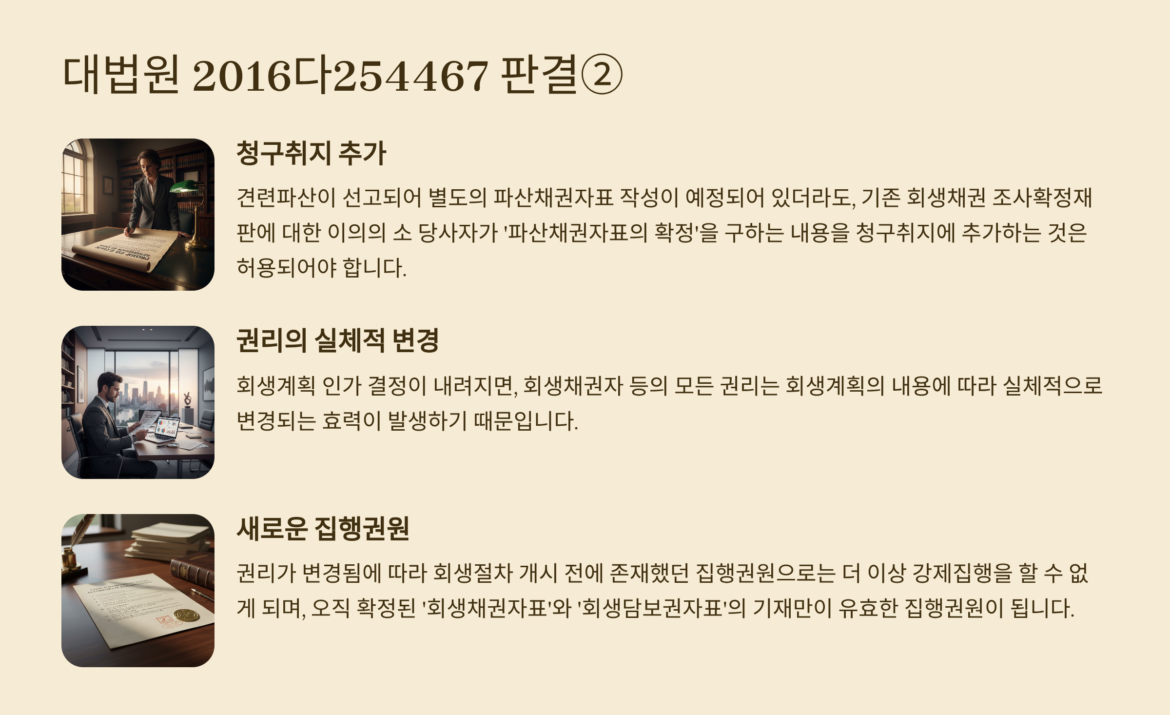 <대법원 2020. 12. 10. 선고 2016다254467,254474 판결> 이는 채무자회생법 제6조 제1항에 의하여 파산선고를 받지 아니한 채무자에 대하여 회생계획인가가 있은 후 회생절차폐지의 결정이 확정된 경우 법원이 그 채무자에게 파산의 원인이 되는 사실이 있다고 인정하여 직권으로 파산을 선고함에 따라 파산절차가 진행된 때에도 마찬가지이므로, 채무자회생법 제464조에서 말하는 ‘이의채권에 관한 소송’에는 종전 회생절차에서 제기되어 진행 중인 회생채권 조사확정재판에 대한 이의의 소도 포함된다고 해석함이 타당하다. 따라서 채무자회생법 제6조 제1항에 의한 파산선고 당시에 종전 회생절차에서 제기되었던 조사확정재판에 대한 이의의 소가 계속 중이라면, 채권자는 채무자회생법 제464조에 따라 이의자 전원을 그 소송의 상대방으로 하여 소송을 수계해야 하고, 이때의 수계신청은 상대방도 할 수 있다. (중략) 다음과 같은 이유로 <채무자회생법 제6조 제1항에 의하여 파산이 선고되어 파산채권 조사확정절차가 진행>된다는 사정만으로는 종전 회생채권 조사확정절차를 통해 회생채권의 존부와 범위를 확정할 법률상 이익이 소멸한다고 단정할 수는 없으므로, 채무자회생법 제6조 제1항에 따라 파산이 선고되어 파산채권자표 작성이 예정되어 있음에도 불구하고 회생채권 조사확정재판에 대한 이의의 소의 당사자가 회생채권자표의 확정을 구하면서 파산채권자표의 확정을 구하는 내용의 청구취지를 추가하고자 한다면, 이는 허용되어야 한다. ① 먼저 회생절차에서 이루어지는 채권조사확정절차는 회생절차개시결정 당시를 기준으로 한 회생채권의 존부와 범위를 정하는 것을 목적으로 하고, 파산절차에서 이루어지는 채권조사확정절차는 파산선고 당시를 기준으로 한 파산채권의 존부와 범위를 정하는 것을 목적으로 한다. 채무자회생법 제6조 제1항에 의하여 파산이 선고되는 경우 그 파산절차에서 채권조사확정의 대상이 되는 파산채권도 파산선고 당시를 기준으로 판단해야 하므로, 종전 회생절차에서 확정된 회생채권이 회생계획에 따라 변경되고 파산선고 당시까지 변제되는 등의 사정을 모두 반영하여 확정되어야 한다. ② 또한 회생계획인가의 결정이 있은 때에는 회생채권자 등의 권리는 회생계획의 내용대로 실체적으로 변경되므로(채무자회생법 제252조 제1항), 회생절차개시 이전에 존재하였던 회생채권 또는 회생담보권에 관한 집행권원에 의하여 강제집행 등은 할 수 없고, 회생채권자표와 회생담보권자표의 기재만이 집행권원이 되지만, 파산폐지결정이 확정되거나 파산종결 후에는 채권자가 파산채권자표의 기재에 의해 강제집행을 할 수 있을 뿐만 아니라(채무자회생법 제548조 제1항, 제535조 제2항), 회생채권자표 등과 같이 파산선고 이전에 존재하였던 파산채권에 관한 집행권원에 의하여도 강제집행을 할 수 있다. 이는 채무자회생법 제6조 제1항에 의한 파산절차에서도 마찬가지이다. |