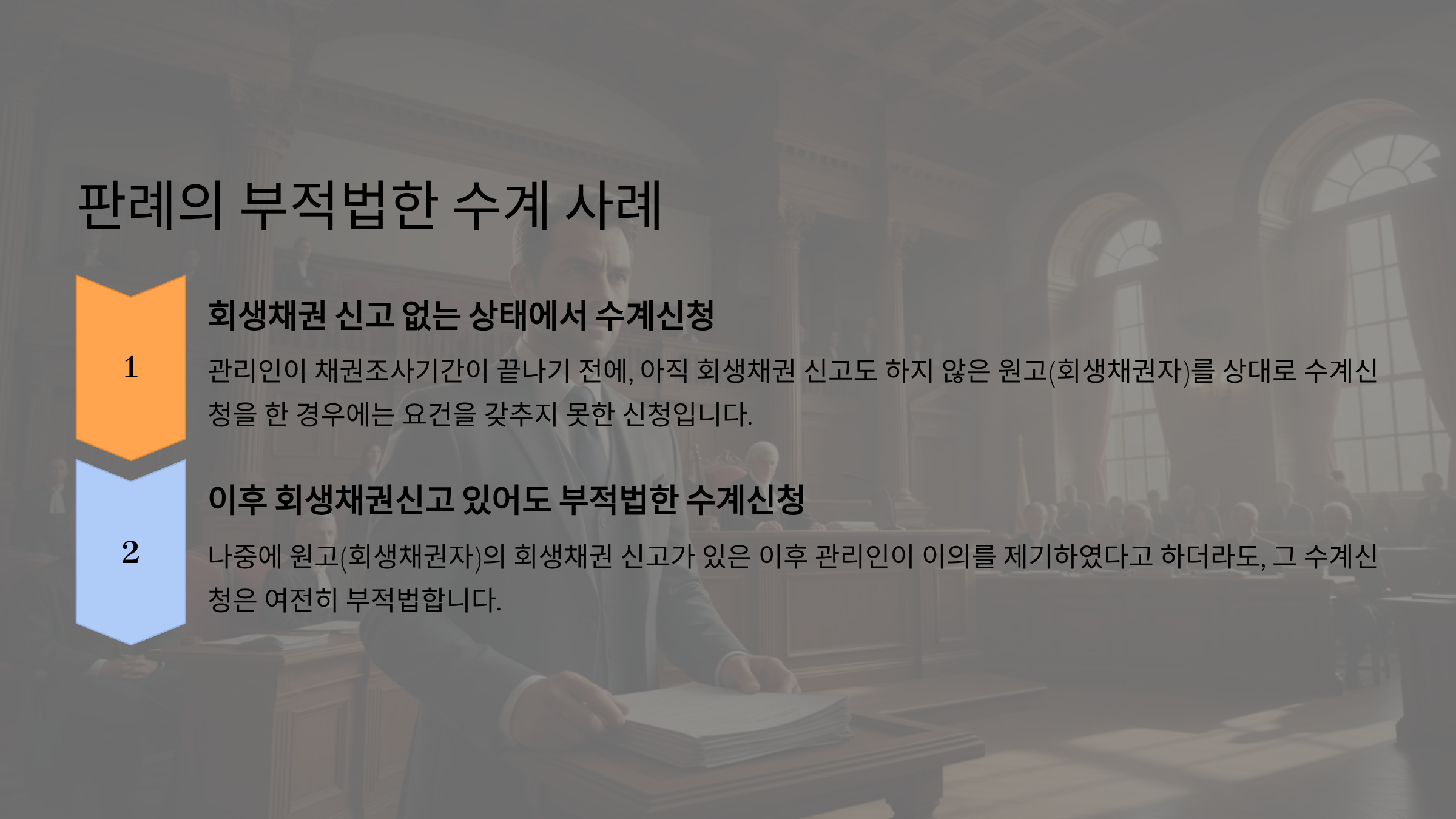 <대법원 2013. 5. 24. 선고 2012다31789 판결> 채무자 회생 및 파산에 관한 법률 제172조의 소송절차 수계는 회생채권확정의 일환으로 진행되는 것으로서 조사기간의 말일까지 이루어지는 관리인 등의 회생채권에 대한 이의를 기다려, 회생채권자가 그 권리의 확정을 위하여 이의자 전원을 그 소송의 상대방으로 하여 신청하여야 하고, 소송수계에서 상대방이 되는 관리인은 그 회생채권에 대한 이의자로서의 지위에서 당사자가 되는 것이므로, 당사자는 이의채권이 되지 아니한 상태에서 미리 소송수계신청을 할 수는 없다고 할 것이어서, 조사기간의 말일 이전에 소송수계신청을 하더라도 이는 부적법하다. (중략) 회생채권자인 원고나 이의자인 관리인이 위 기간 내에 수계신청을 한 사실이 없는바, 그렇다면 이 사건 소는 부적법하게 되었다고 할 것이다. 관리인 소외인이 채권조사기간이 경과하기 전에 아직 회생채권 신고도 하지 않은 원고를 상대로 수계신청을 하고, 수계신청 이후에 관리인 소외인이 원고의 회생채권 신고에 따른 적법한 이의를 하여 이의자가 되었다고 하더라도, 이를 적법한 수계신청으로 볼 수도 없다. |