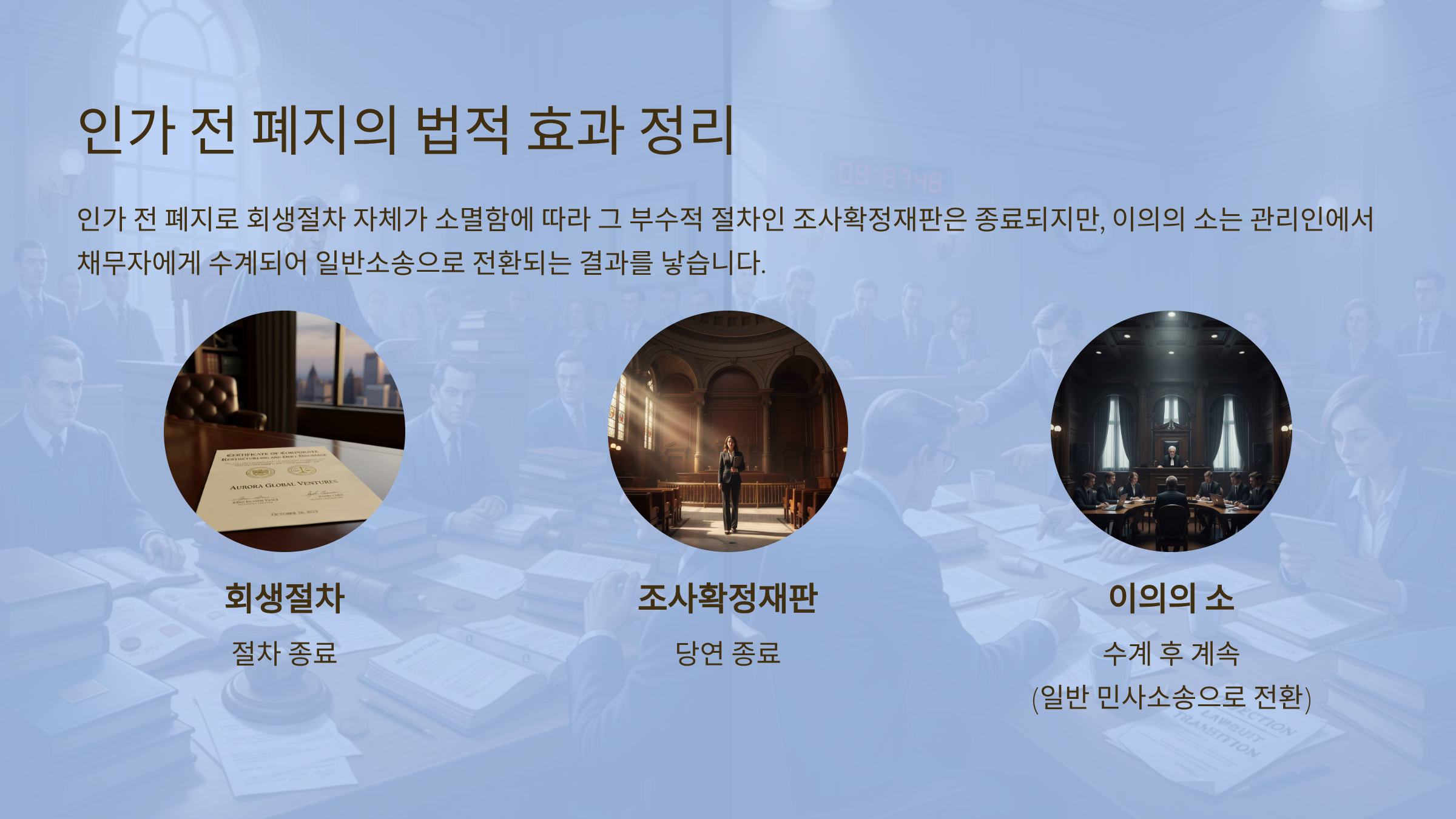 결국 인가 전 폐지는 회생절차 자체가 소멸함에 따라 그 부수적 절차인 조사확정재판은 종료되지만, 이의의 소는 관리인에서 채무자에게 수계되어 일반소송으로 전환되는 결과를 낳는다.