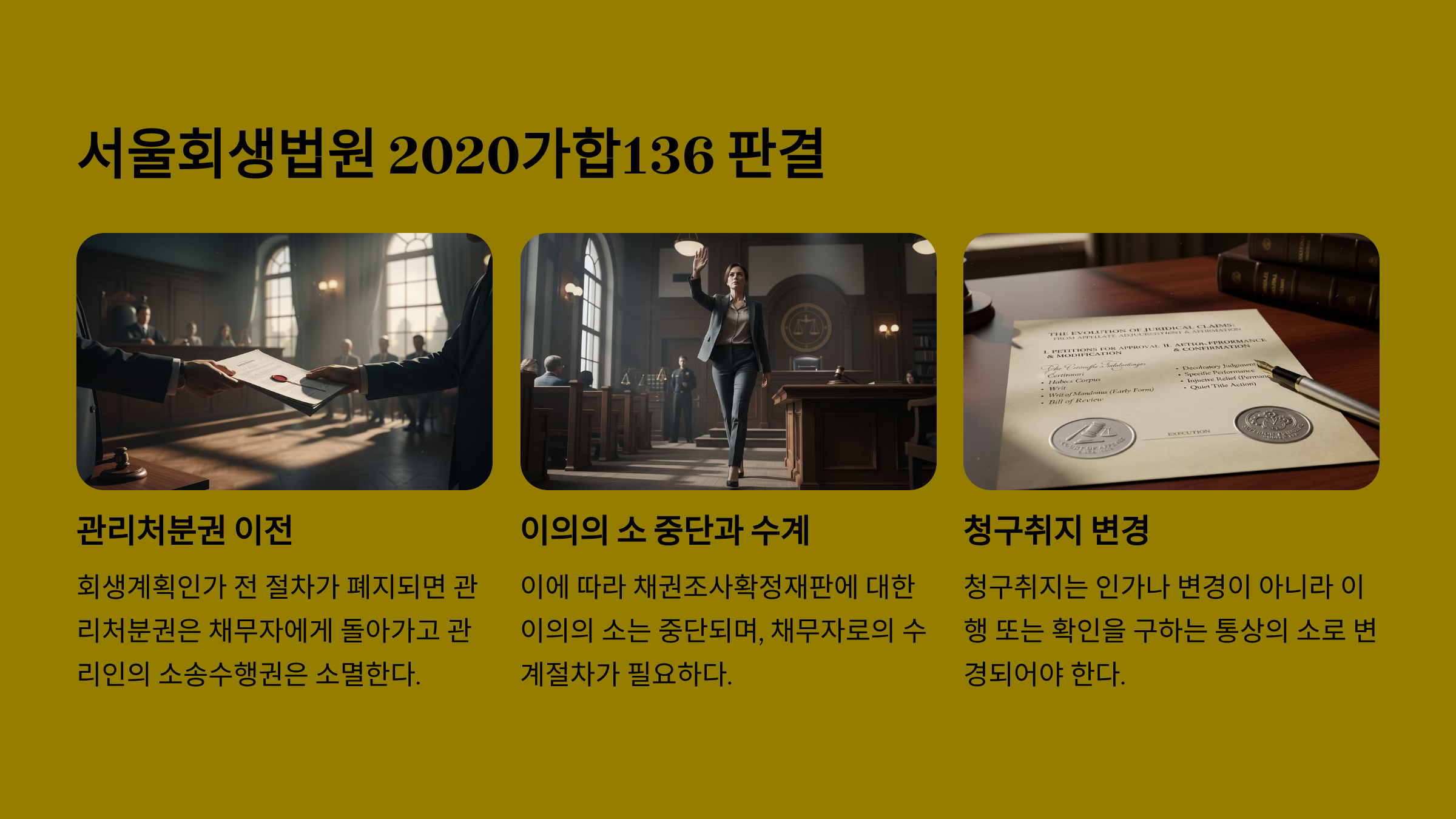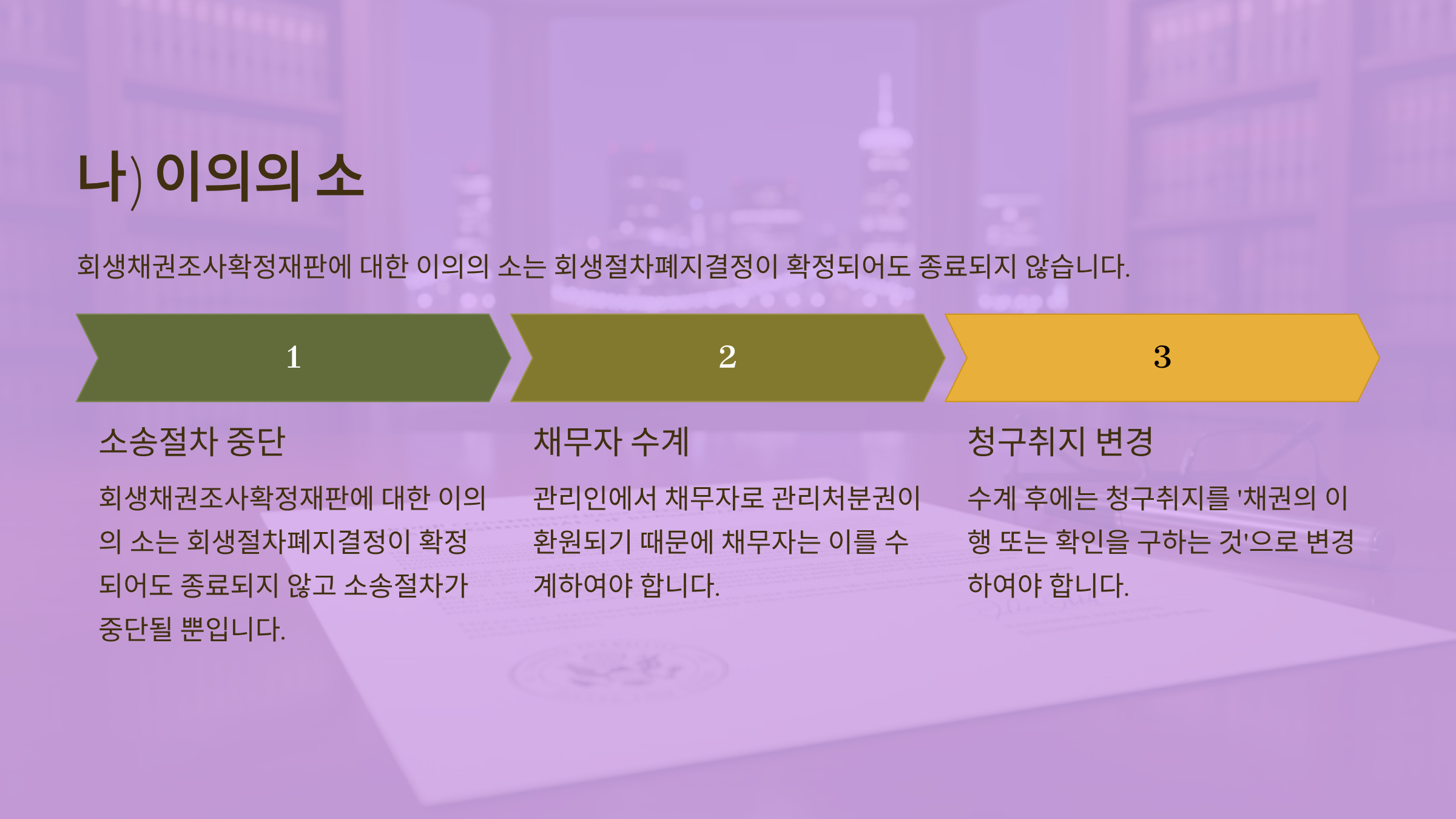 <서울회생법원 2021. 5. 26. 선고 2020가합136 판결> 회생계획인가결정 전 회생절차가 폐지된 경우 채무자의 관리인에서 채무자에게 관리처분권이 이전되므로 채권조사확정재판에 대한 이의의 소의 소송절차는 중단되고 채무자로의 수계절차를 밟아야 한다. 이때 청구취지는 채권조사확정재판의 인가 또는 변경을 구하는 것에서 이행 내지 확인을 구하는 것으로 변경(통상의 소송으로 변경)하여야 한다. |