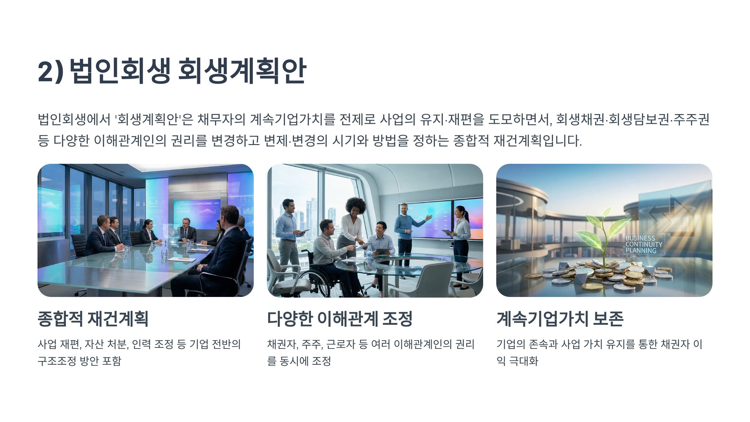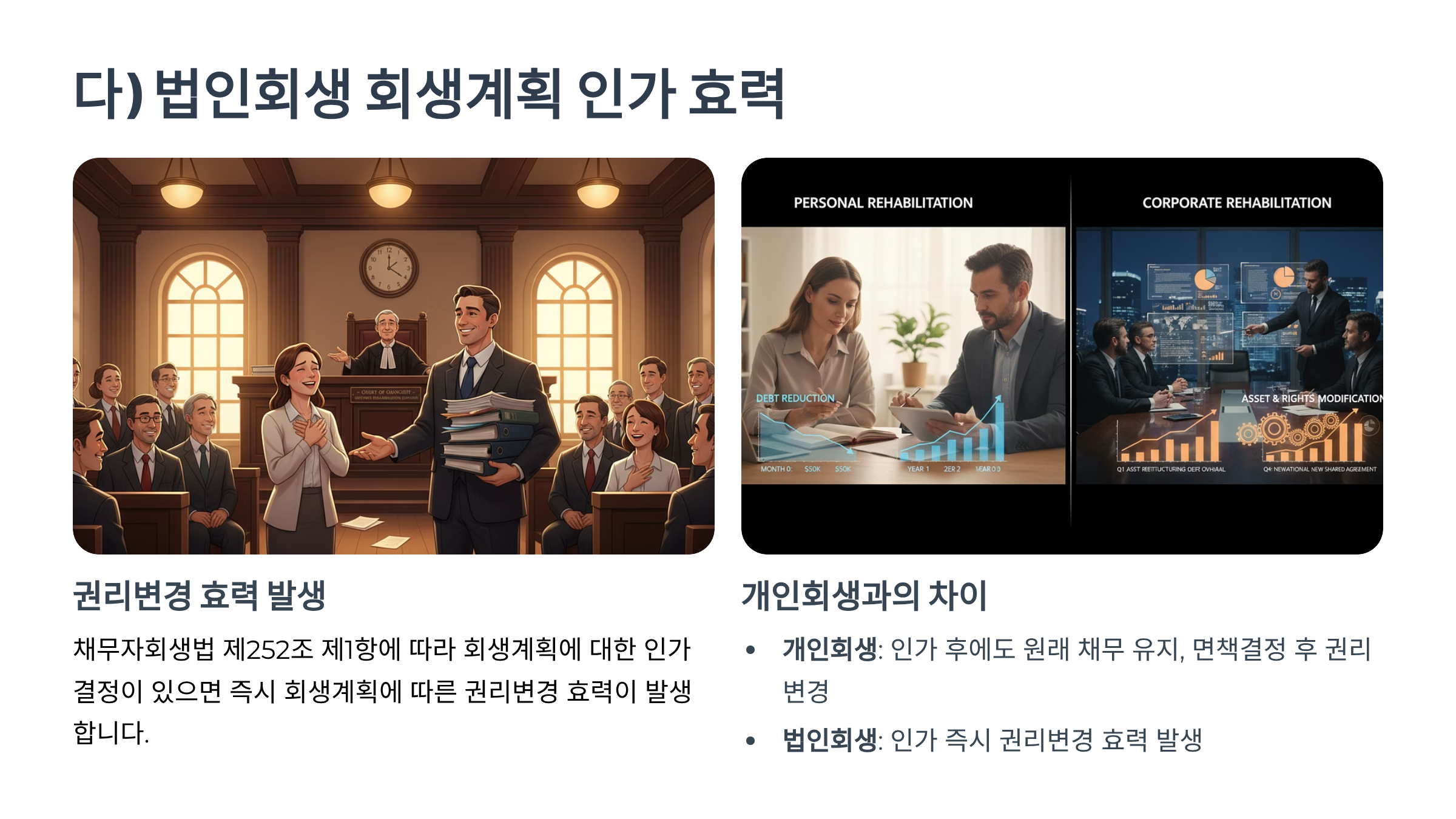 ②법인회생에서 '회생계획안(변제계획안)'은 채무자의 계속기업가치를 전제로 사업의 유지·재편을 도모하면서, 회생채권·회생담보권·주주권 등 다양한 이해관계인의 권리를 변경하고 변제·변경의 시기와 방법을 정하는 종합적 재건계획이다.