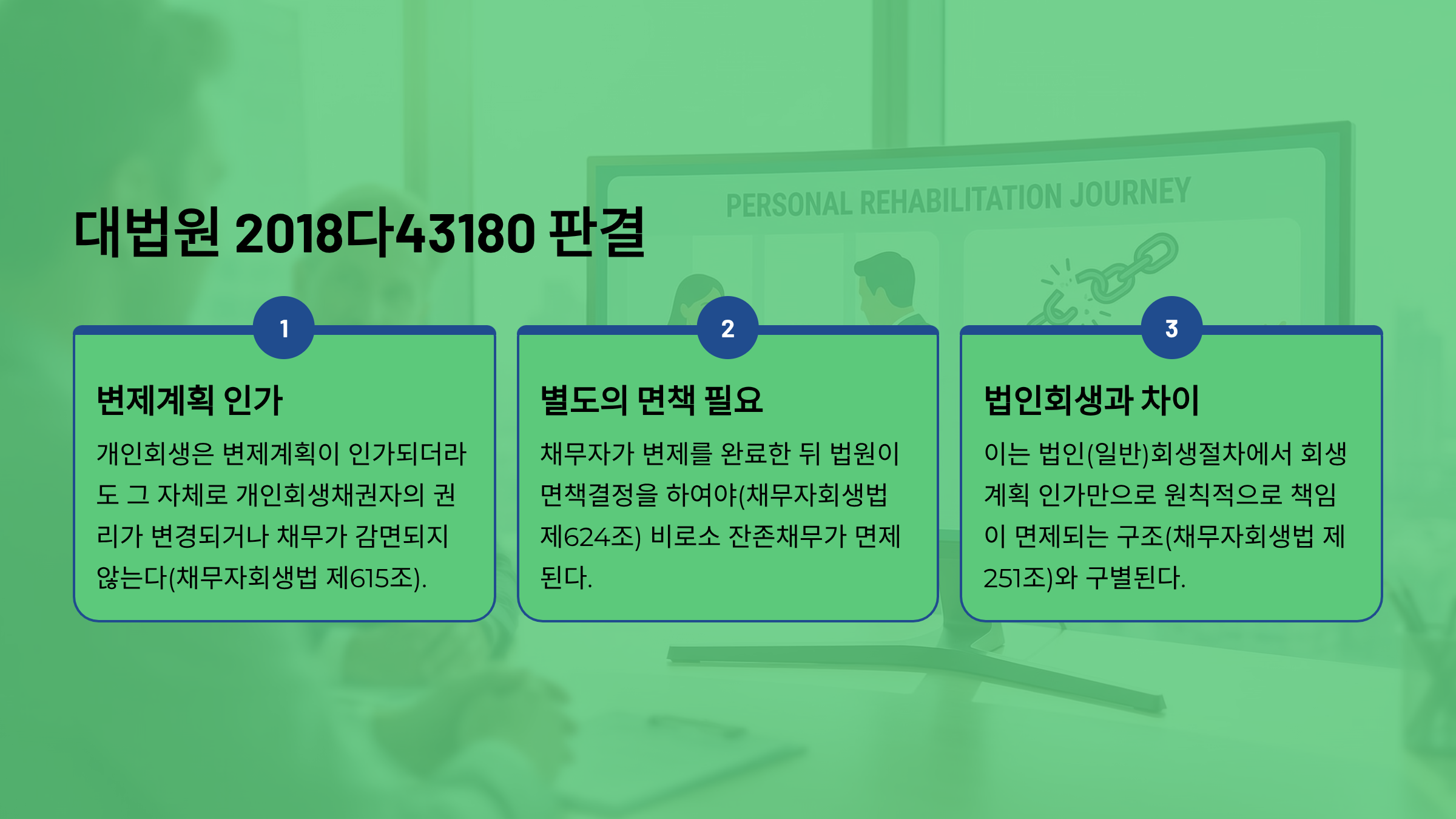 <대법원 2021. 2. 25. 선고 2018다43180 판결> 채무자 회생 및 파산에 관한 법률(이하 ‘채무자회생법’이라고 한다)상 개인회생절차에서는 변제계획인가결정으로 개인회생채권자의 권리가 변경되지 않고, 면책결정으로 그 책임이 면제된다(채무자회생법 제615조). 즉, 개인회생절차의 변제계획이 인가되었다 하더라도, 변제계획 자체로 권리변경의 효력을 발생시키는 형성적 효력을 갖는 것이 아니라, 단지 변제계획에서 정하여진 변제기간 동안 정해진 변제율과 변제방법에 따라 변제를 완료하면 추후 면책신청절차를 통해 면책결정을 받아 변제계획에 포함된 나머지 채무를 모두 면책받을 수 있다는 취지를 채권자들에게 명백히 알리는 의미만 있을 뿐이고, 채무자가 변제계획에 따른 변제를 완료한 후 채무자회생법 제624조에 따른 법원의 면책결정이 있어야 비로소 면책의 효과가 발생한다. 이는 개인회생절차가 아닌 회생절차에서 회생계획인가의 결정이 있는 때에 회생계획이나 채무자회생법의 규정에 의해 인정된 권리를 제외하고는 채무자는 모든 회생채권과 회생담보권에 관한 책임을 면하는 경우(채무자회생법 제251조)와 구별된다. |