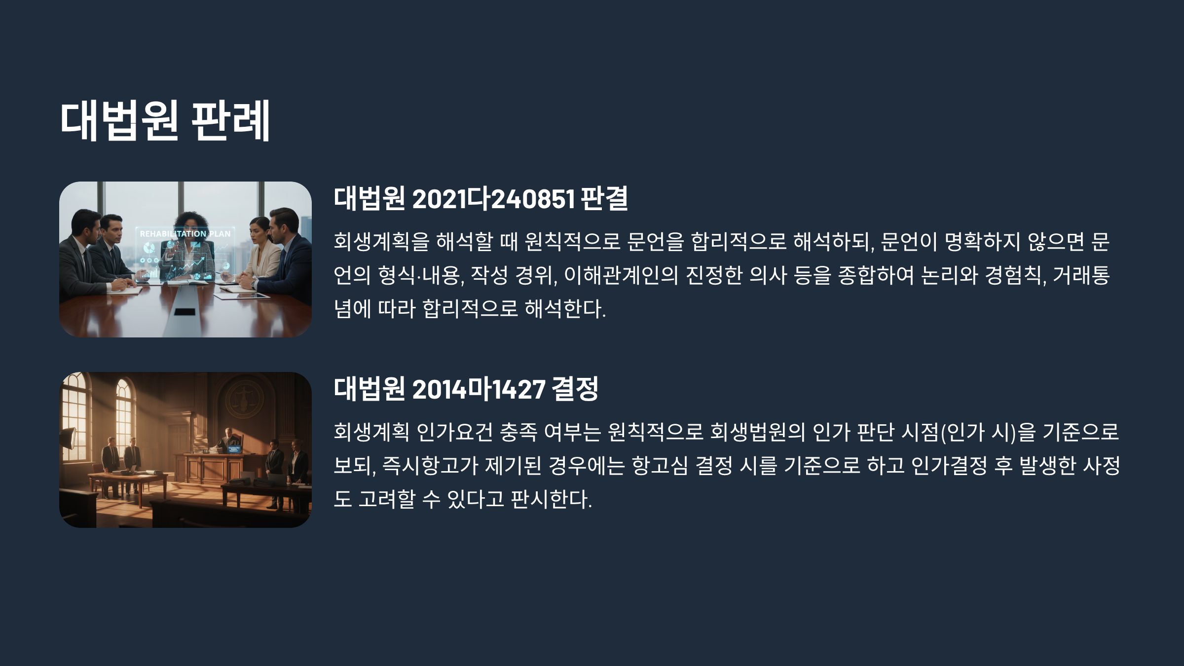 <대법원 2021. 10. 14. 선고 2021다240851 판결> 회생계획은 법률행위의 해석 방법에 따라 해석해야 한다. 회생계획 문언의 의미를 합리적으로 해석하되, 문언의 의미가 명확하지 않은 경우에는 문언의 형식과 내용, 회생계획안 작성 경위, 회생절차 이해관계인들의 진정한 의사 등을 종합적으로 고려하여 논리와 경험의 법칙, 사회일반의 상식과 거래의 통념에 따라 합리적으로 해석해야 한다. <대법원 2016. 5. 25.자 2014마1427 결정> 회생계획이 인가요건을 충족하고 있는지는 회생법원이 인가 여부를 판단하는 시점, 즉 인가 시를 기준으로 하여야 하는 것이 원칙이나, 회생계획 인가결정에 대하여 즉시항고가 제기된 경우에는 항고심의 속심적 성격에 비추어 볼 때 항고심 결정 시를 기준으로 판단하여야 하고, 항고심이 고려하여야 할 사항에는 회생법원의 회생계획 인가결정 후에 발생한 사정도 포함된다. 그런데 이는 항고심이 인가결정 당시의 회생법원의 고려사항과 다르게 회생계획인가 이후에 변동된 사정이 없는지를 심리하여 인가결정의 당부를 판단하라는 취지이므로, 항고심이 회생법원의 회생계획 인가결정 당시에 예정되어 있던 회생계획의 수행결과까지 고려하여 회생계획 인가요건의 충족 여부를 판단하여야 하는 것은 아니다. |