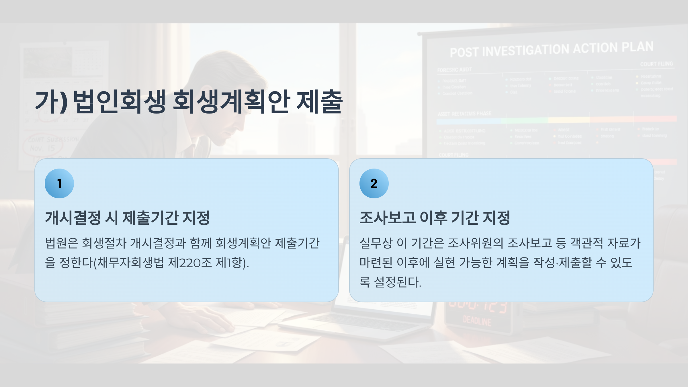 ㉠법원은 개시결정과 함께 회생계획안을 제출할 수 있는 기간을 정하는데(채무자회생법 제220조 제1항), 통상 조사위원의 조사보고 등 객관적 자료가 갖추어진 이후에 실현 가능한 회생계획을 작성하여 제출할 수 있도록 정한다.