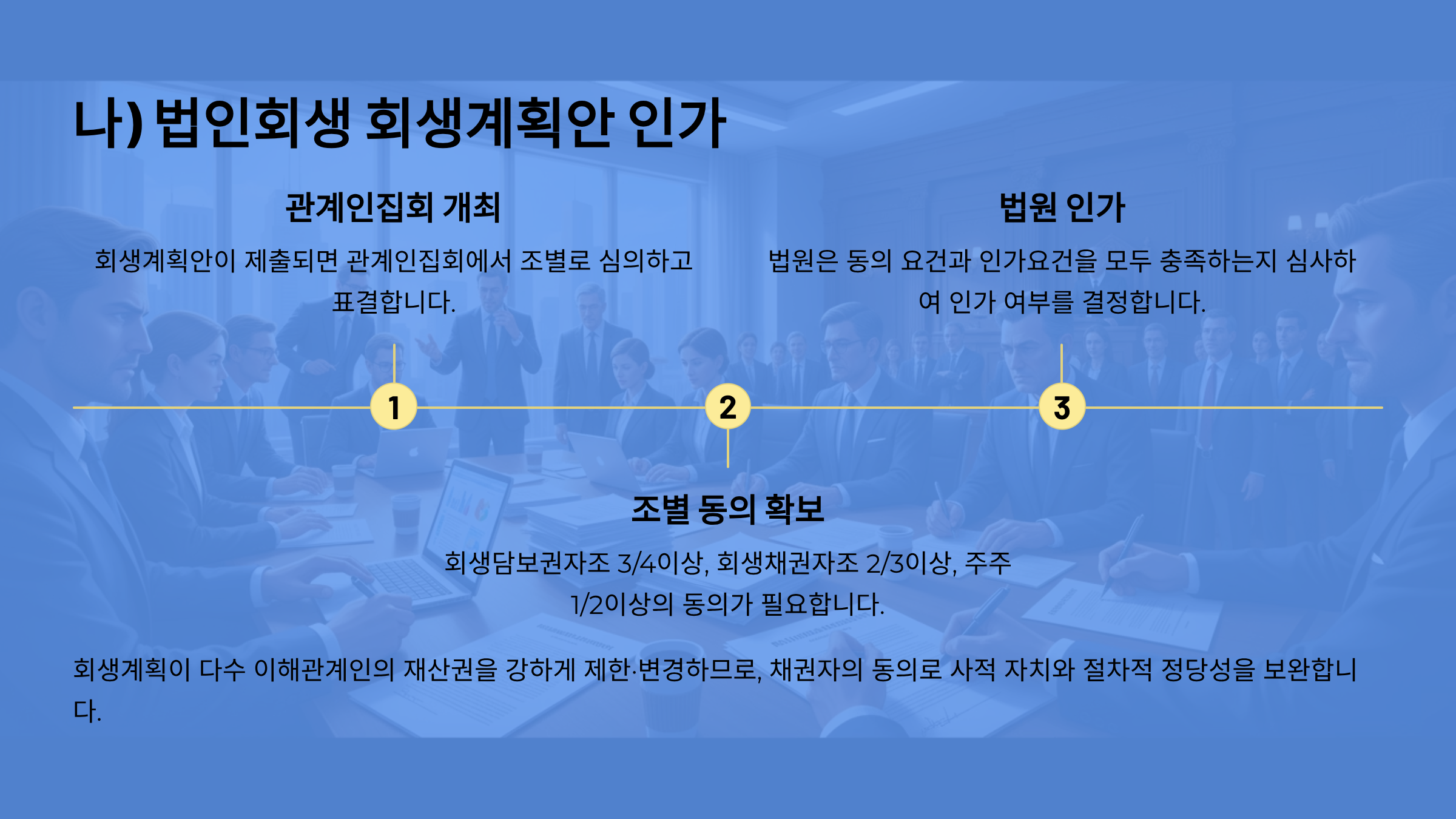 ㉡회생계획안이 제출되면 관계인집회에서의 조별 동의 요건(회생담보권자조 3/4이상, 회생채권자조 2/3이상, 주주 1/2이상의 동의)을 확보하여야 한다. 이는 회생계획이 다수 이해관계인의 재산권을 강하게 제한·변경하므로, 사적 자치와 절차적 정당성을 채권자의 동의로 보완하기 위함이다.