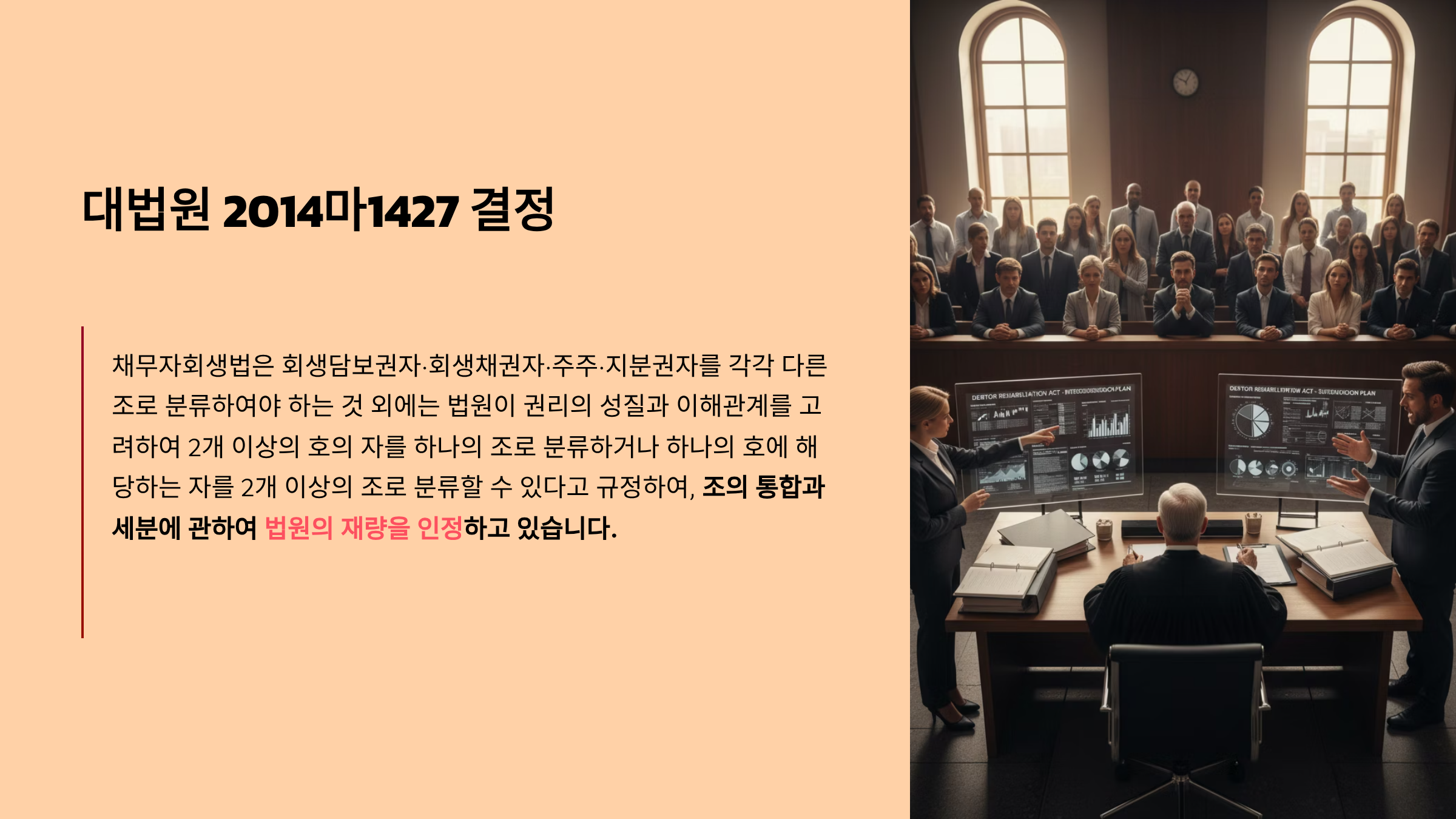 이러한 법률과 판례의 태도에 비추어 볼 때, 조분류는 '권리의 성질'과 '이해관계의 유사성' 등 합리적 기준에 따라야 한다(채무자회생법 제236조 제3항). 성질이 다른 권리를 억지로 동일 조에 묶는 것은 평등원칙에 반하고, 반대로 성질이 동일함에도 부당하게 조를 나누는 것은 가결요건을 형해화하려는 인위적 분리가 될 수 있다.