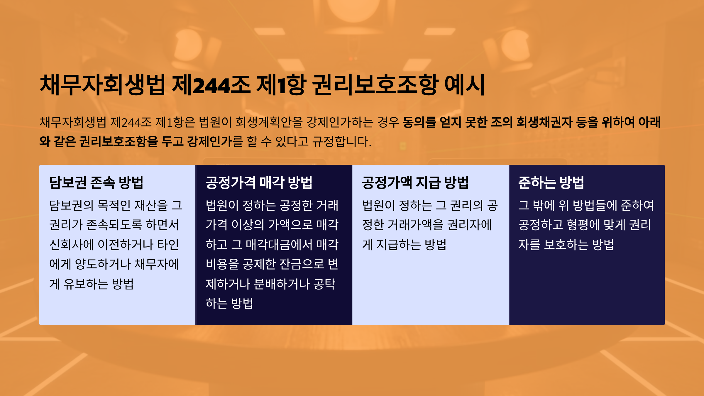 <채무자회생법> 제244조 (동의하지 아니하는 조가 있는 경우의 인가) ①회생계획안에 관하여 관계인집회에서 결의하거나 제240조의 규정에 의한 서면결의에 부치는 경우 법정의 액 또는 수 이상의 의결권을 가진 자의 동의를 얻지 못한 조가 있는 때에도 법원은 회생계획안을 변경하여 그 조의 회생채권자·회생담보권자·주주·지분권자를 위하여 다음 각호의 어느 하나에 해당하는 방법에 의하여 그 권리를 보호하는 조항을 정하고 회생계획인가의 결정을 할 수 있다. 1. 회생담보권자에 관하여 그 담보권의 목적인 재산을 그 권리가 존속되도록 하면서 신회사에 이전하거나 타인에게 양도하거나 채무자에게 유보하는 방법 2. 회생담보권자에 관하여는 그 권리의 목적인 재산을, 회생채권자에 관하여는 그 채권의 변제에 충당될 채무자의 재산을, 주주·지분권자에 관하여는 잔여재산의 분배에 충당될 채무자의 재산을 법원이 정하는 공정한 거래가격(담보권의 목적인 재산에 관하여는 그 권리로 인한 부담이 없는 것으로 평가한다) 이상의 가액으로 매각하고 그 매각대금에서 매각비용을 공제한 잔금으로 변제하거나 분배하거나 공탁하는 방법 3. 법원이 정하는 그 권리의 공정한 거래가액을 권리자에게 지급하는 방법 4. 그 밖에 제1호 내지 제3호의 방법에 준하여 공정하고 형평에 맞게 권리자를 보호하는 방법 |