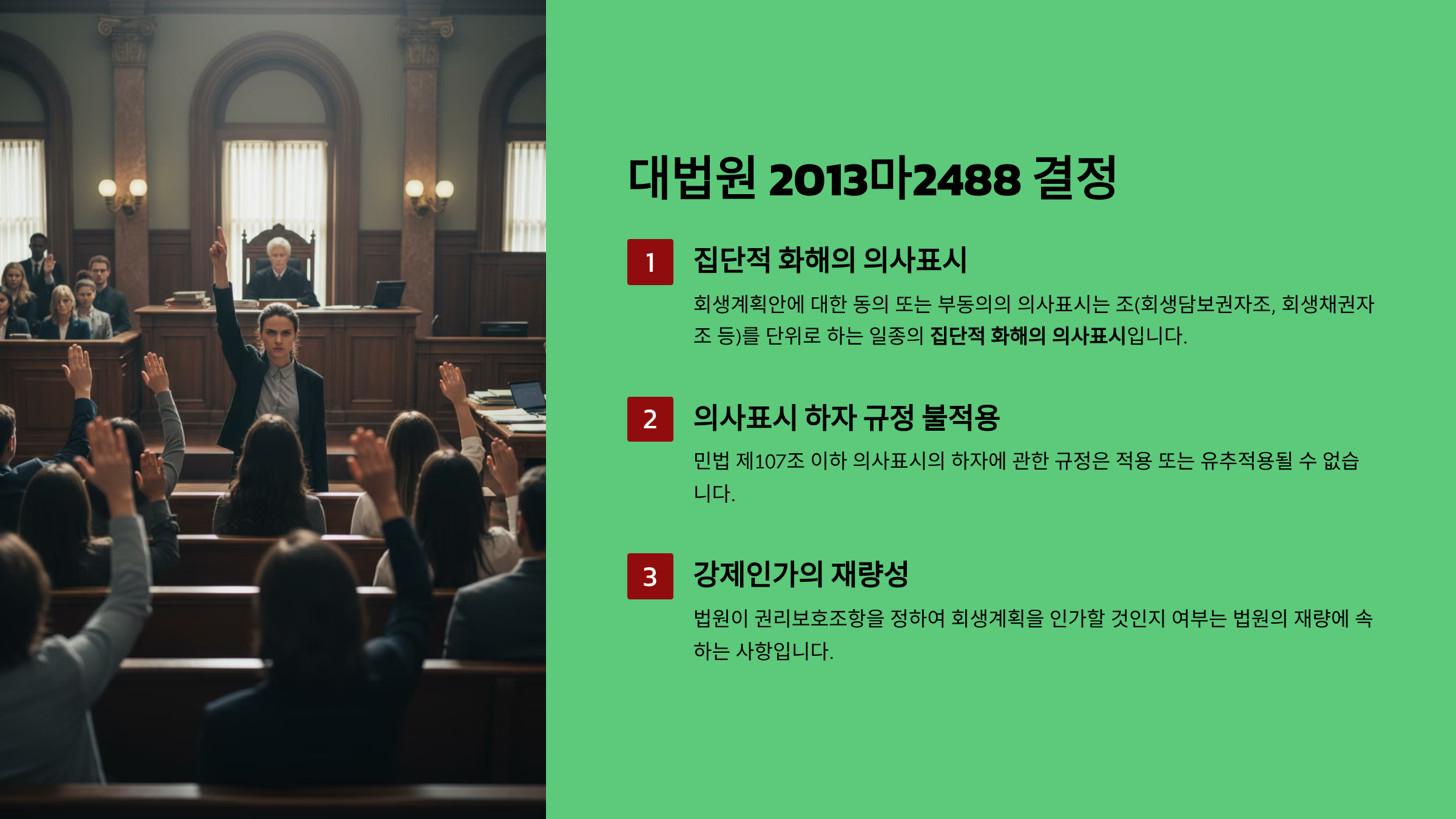 <대법원 2014. 3. 18.자 2013마2488 결정> 관계인집회에서의 회생계획안에 대한 동의 또는 부동의의 의사표시는 조(회생담보권자조, 회생채권자조 등)를 단위로 하는 일종의 집단적 화해의 의사표시로서 재판절차상의 행위이고 관계인 사이에 일체 불가분적으로 형성되는 집단적 법률관계의 기초가 되는 것이어서 내심의 의사보다 표시를 기준으로 하여 효력 유무를 판정하여야 한다. 따라서 거기에 민법 제107조 이하 의사표시의 하자에 관한 규정은 적용 또는 유추적용될 수 없다. 그리고 관계인집회에서 회생계획안에 관하여 일부의 조에서 법정 다수의 동의를 얻지 못한 경우에 채무자 회생 및 파산에 관한 법률 제244조에 따라 권리보호조항을 정하여 회생계획을 인가할 것인지 여부는 법원의 재량에 속하는 사항이므로, 법원이 권리보호조항을 정하여 정리계획안을 인가하지 않았음을 이유로 항고할 수 없다. |