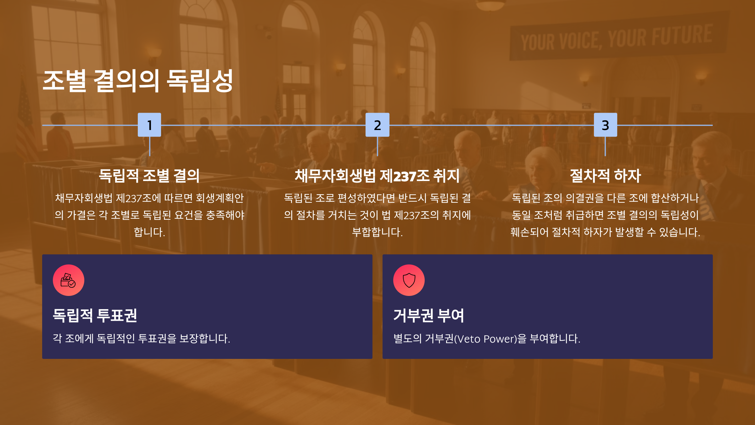 채무자회생법 제237조에 따르면 회생계획안의 가결은 각 조별로 독립된 요건을 충족해야 한다. 따라서 독립된 조로 편성하였다면 반드시 독립된 결의 절차를 거치는 것이 법 제237조의 취지에 부합한다. 조를 분리한다는 것은 해당 집단에게 독립적인 '투표권'을 보장한다는 의미도 있지만, 별도의 '거부권(Veto Power)'을 부여한다는 의미도 있다.