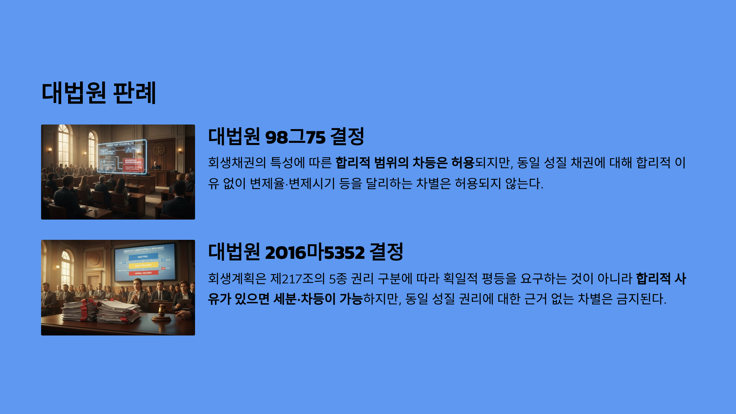 과거 대법원 98그75 결정에서도 평등이란 기계적 평등이 아닌 공정·형평에 부합하는 실질적 평등을 의미한다고 판시한 바 있으며, 이 논리는 회생절차에서도 동일하게 적용된다. 다만, 최근 판례는 평등원칙을 더욱 엄격하게 적용하는 경향을 보이고 있다.