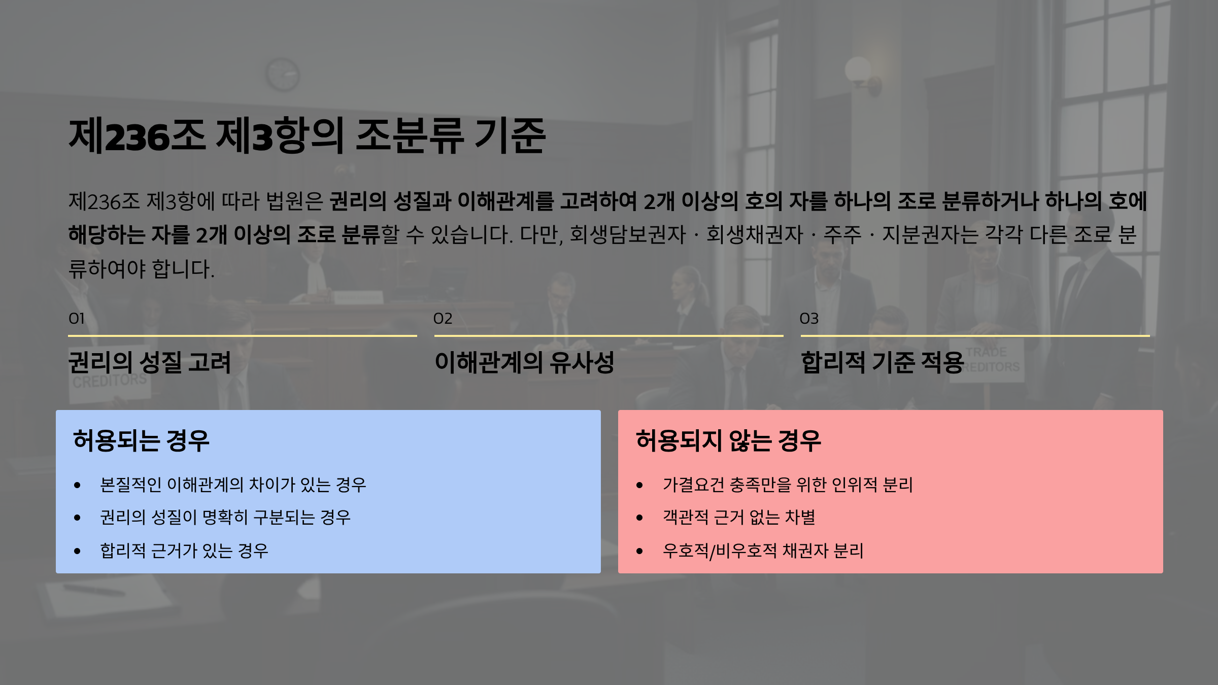 ②채무자회생법 제236조 제2항은 회생담보권, 우선권 있는 회생채권, 그 외의 회생채권, 주주·지분권자 등으로 기본 조를 구성하도록 하였고, 제236조 제3항은 '법원의 재량'에 의해 동일한 호에 해당하는 권리자라도 2개 이상의 조로 세분하거나 2개 이상의 조에 해당하는 권리자라도 1개의 조로 분류할 수 있음을 명시하고 있다.