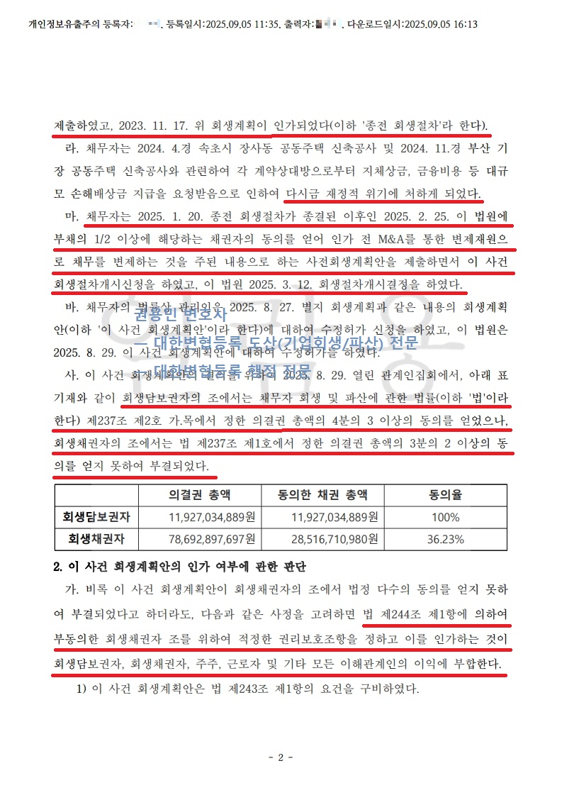 2025. 09. 05. '중견종합건설업체' 회생강제인가 사례