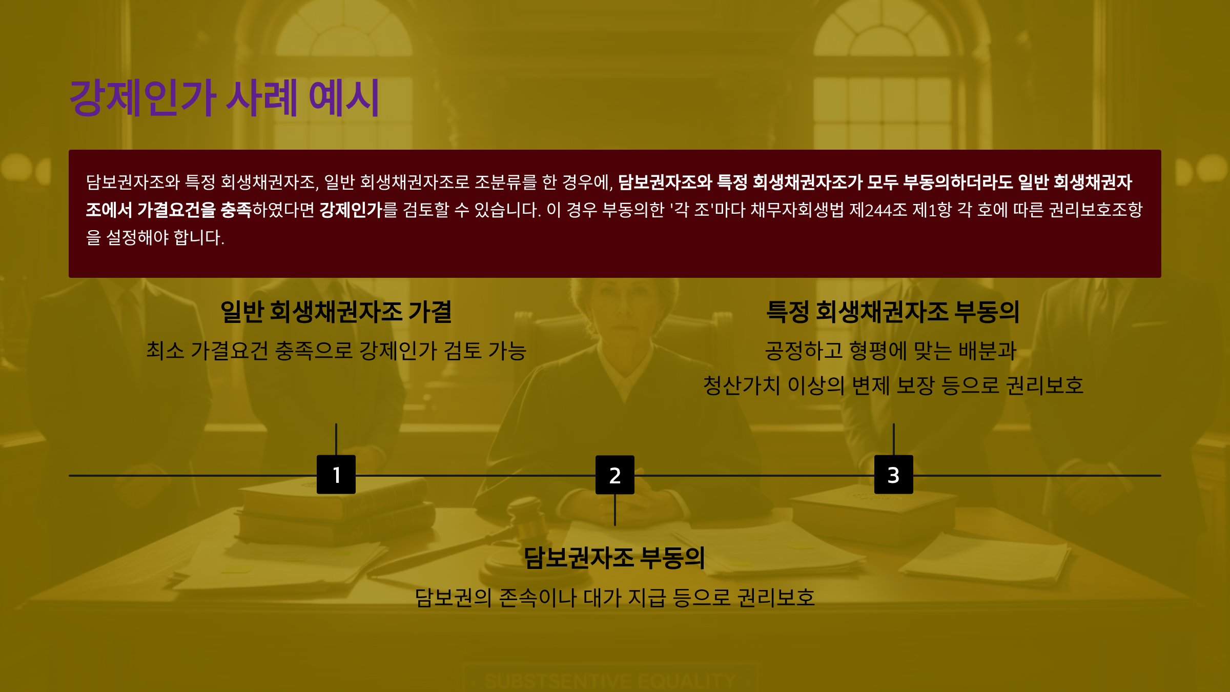 이론적으로는 담보권자조와 특정 회생채권자조, 일반 회생채권자조로 조분류를 한 경우에, 담보권자조와 특정 회생채권자조가 모두 부동의하더라도 일반 회생채권자조에서 가결요건을 충족하였다면 강제인가를 검토할 수 있다.