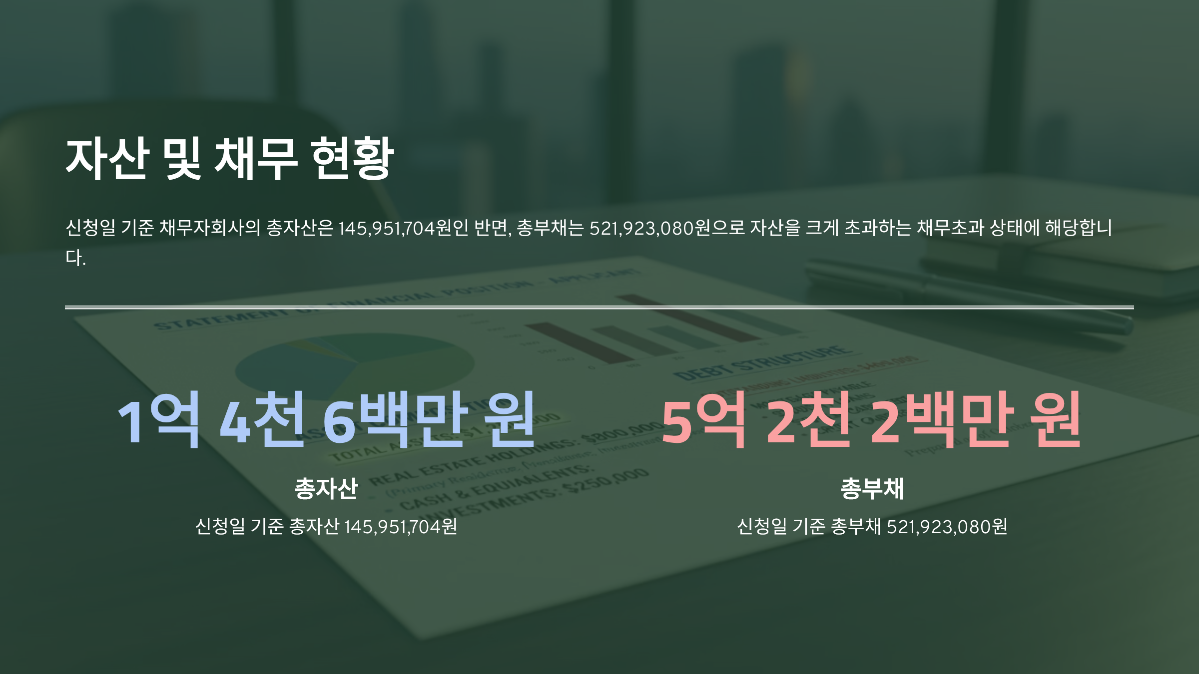 신청일 기준 채무자회사의 총자산은 145,951,704원인 반면, 총부채는 521,923,080원으로 자산을 크게 초과하는 채무초과 상태에 해당한다.