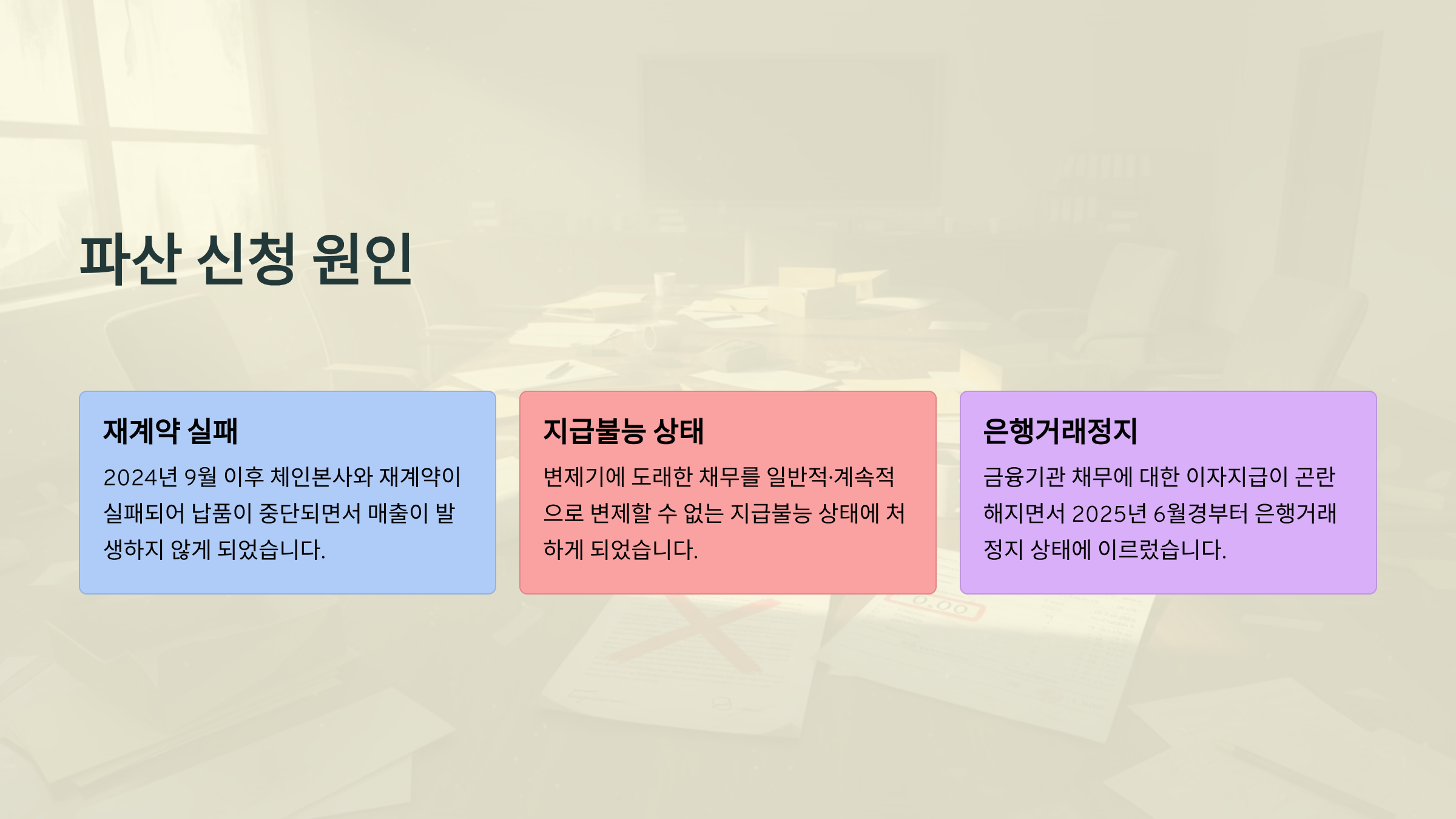 채무자회사는 2024년 9월 이후 체인본사와 재계약이 실패되어 납품이 중단되면서 매출이 발생하지 않게 되었고, 그 결과 변제기에 도래한 채무를 일반적·계속적으로 변제할 수 없는 지급불능(지급정지) 상태에 처하게 된다. 실제로 금융기관 채무에 대한 이자지급이 곤란해지면서 2025년 6월경부터 은행거래정지 상태에 이르렀다.