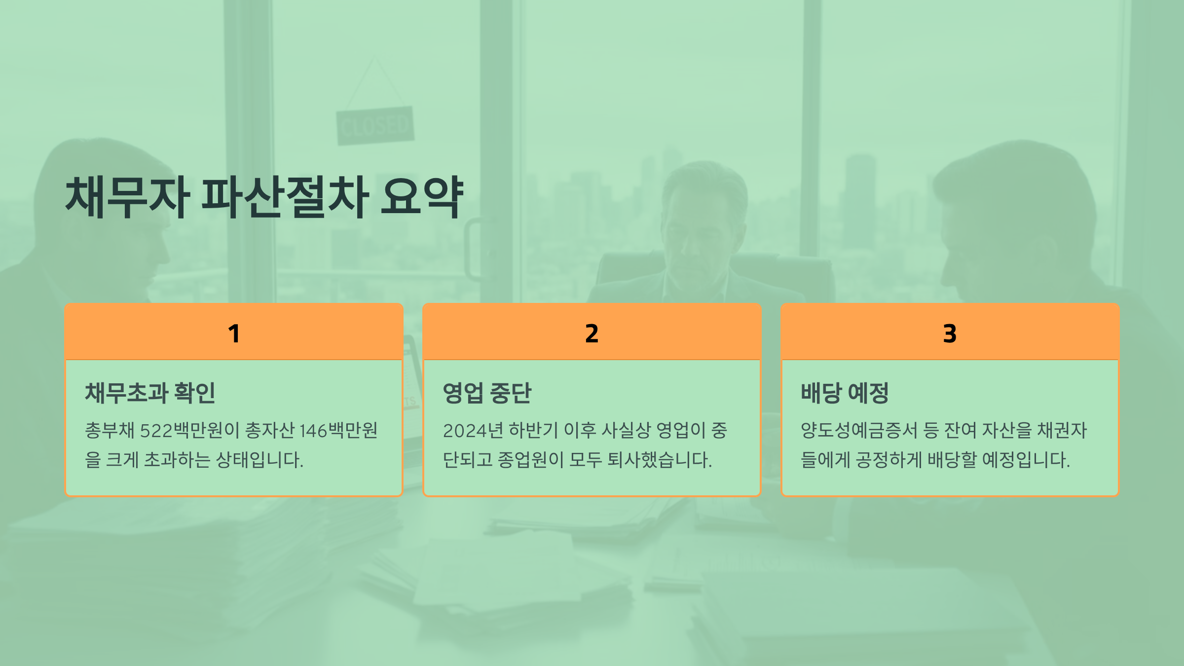 채무자회사는 설립 후 한동안 매출을 확대하였으나, 2024년 9월경 체인본사와의 재계약 실패 및 거래 단절을 기점으로 납품이 사실상 중단되어, 현재는 영업활동이 중단되고 매출이 없는 상태에 이르렀다. 이 과정에서 직원들은 모두 퇴사하여 현재 종업원이 없고, 회사는 실질적으로 계속기업으로서 기능하기 어려운 상태에 놓이게 되었다.