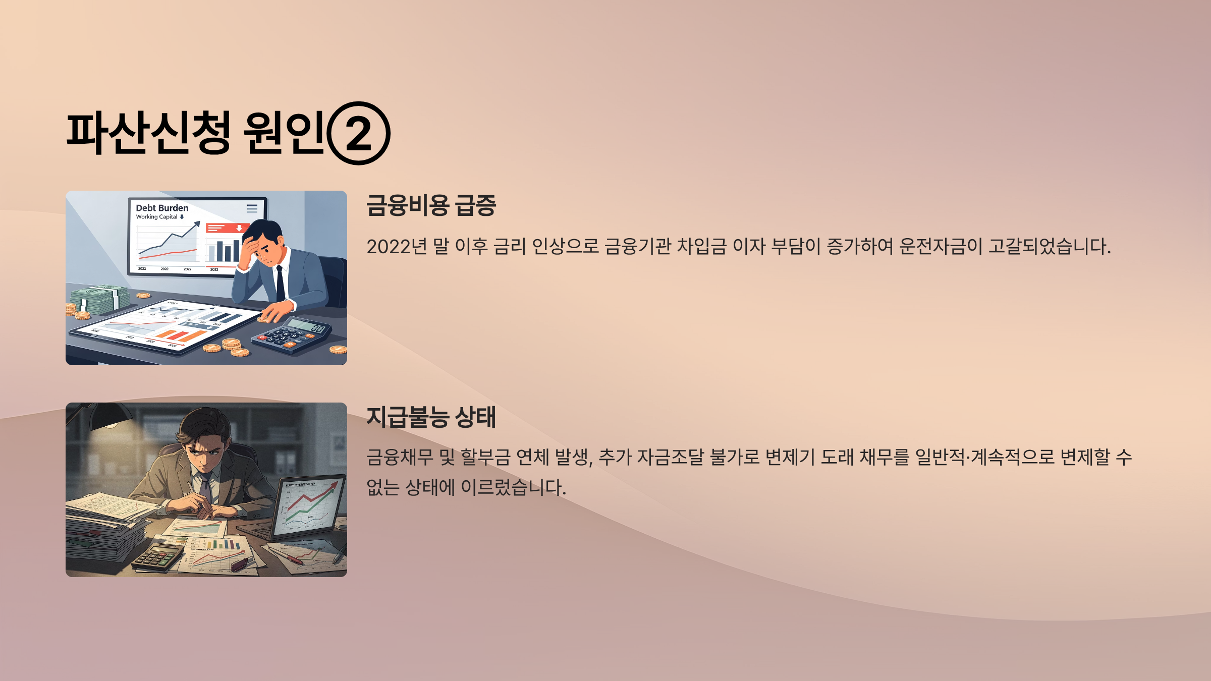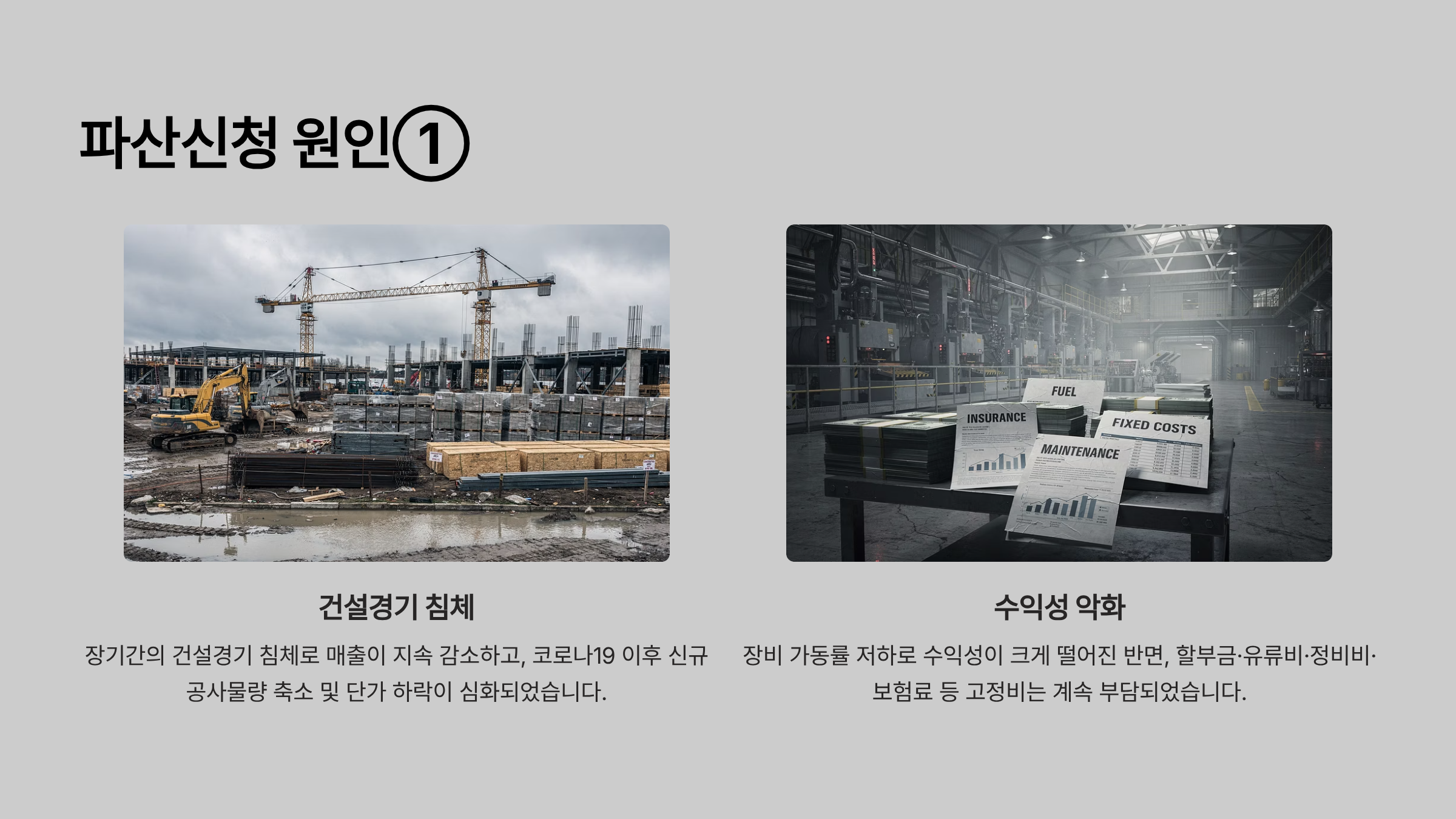 채무자회사의 파산신청 원인은 장기간의 건설경기 침체에 따른 매출 감소, 코로나19 이후 신규 공사물량 축소와 단가 하락, 장비 가동률 저하에 따른 수익성 악화, 그리고 2022년 말 이후 금리 인상에 따른 금융비용 증가로 요약된다.