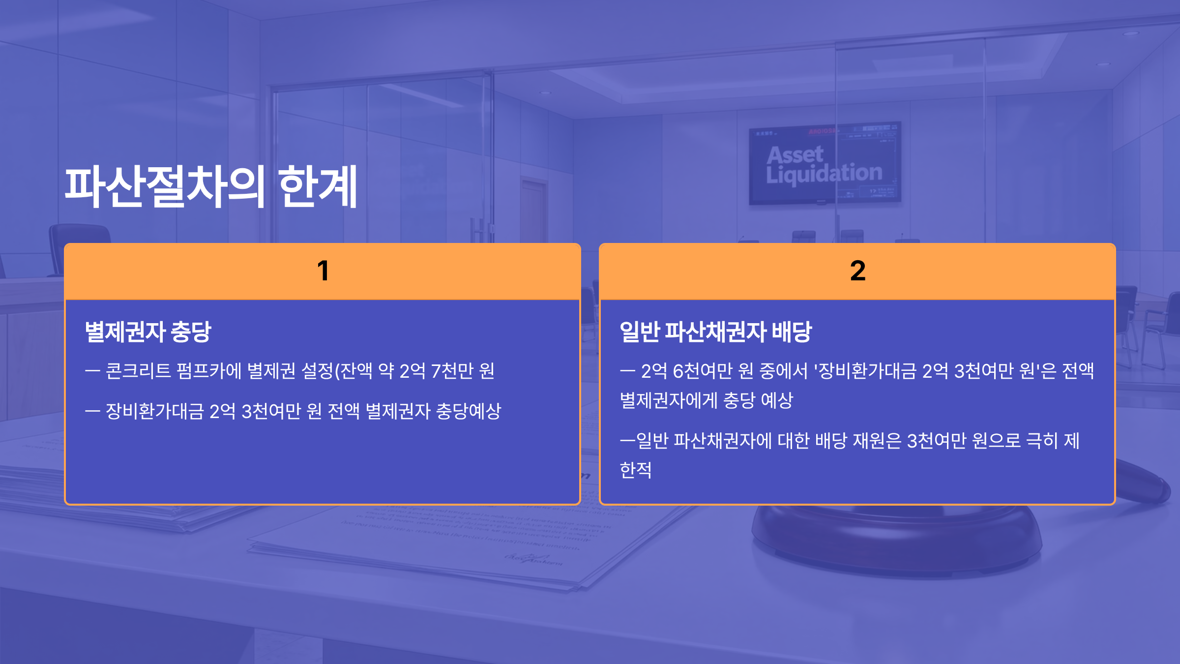 따라서 장비의 환가대금 2억 3천여만 원은 전액 별제권자의 권리행사에 충당될 것으로 예상되어, 일반 파산채권자에게 실질적으로 배당 가능한 재원은 3천여만 원 수준에 불과하다. 결국 파산절차에서 실질적인 배당재원이 매우 제한적이다.