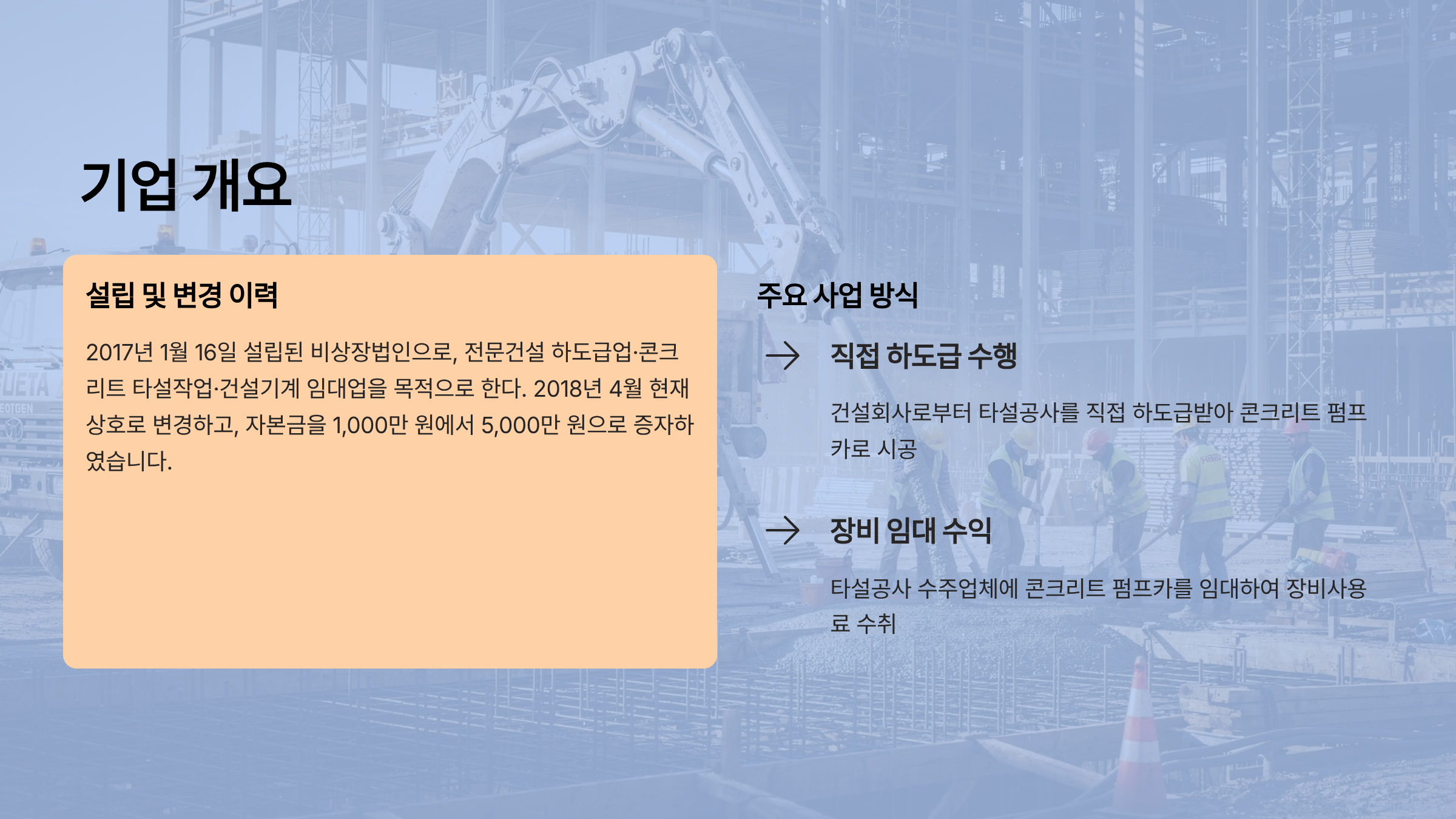 채무자회사는 콘크리트 펌프카를 이용한 건설현장 타설작업을 주된 사업으로 영위하였고, 영업방식은 건설회사로부터 타설공사를 직접 하도급받아 수행하는 방식과, 타설공사를 수주한 업체에 콘크리트 펌프카를 임대하여 장비사용료를 수취하는 방식으로 구성된다.