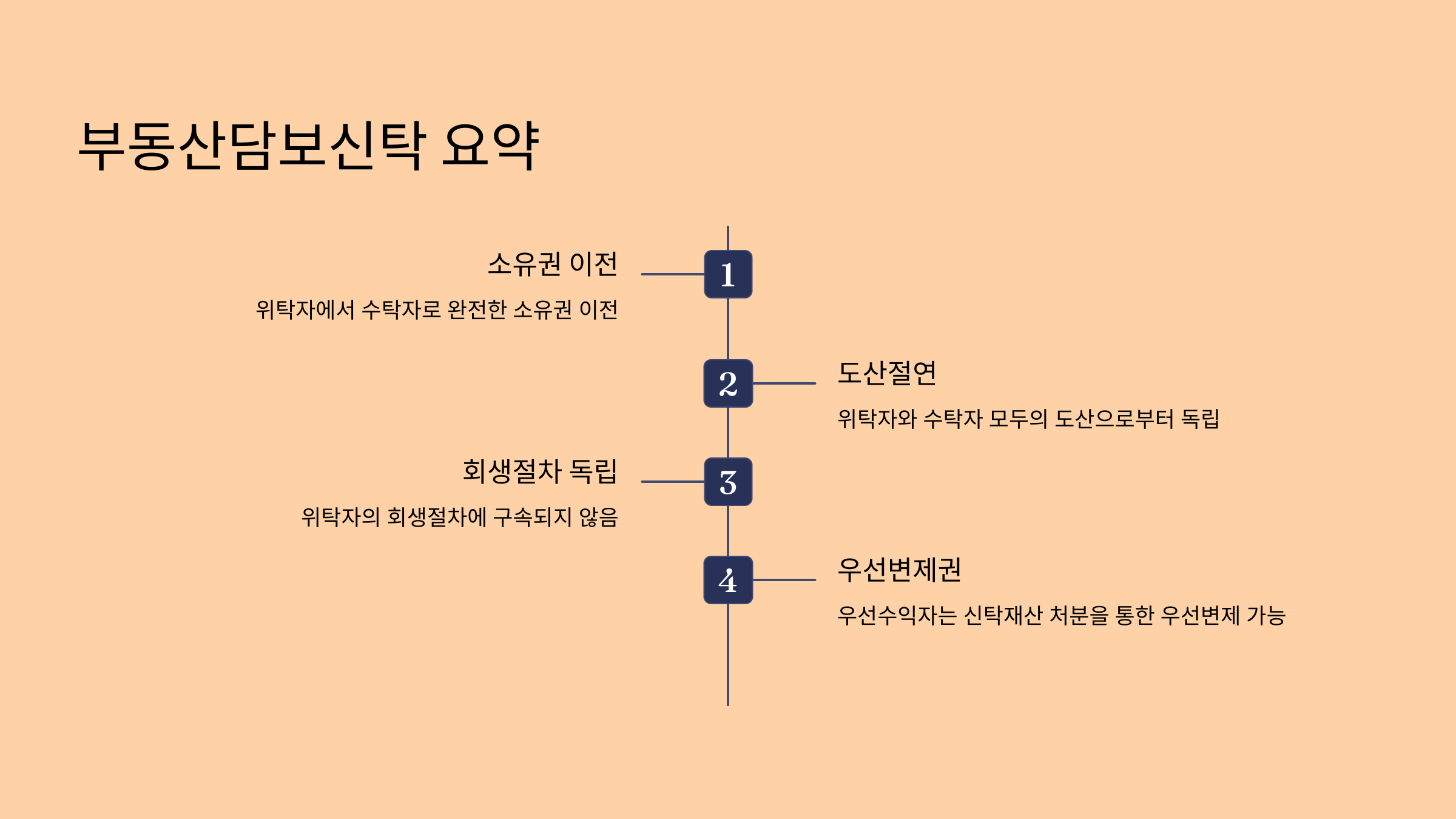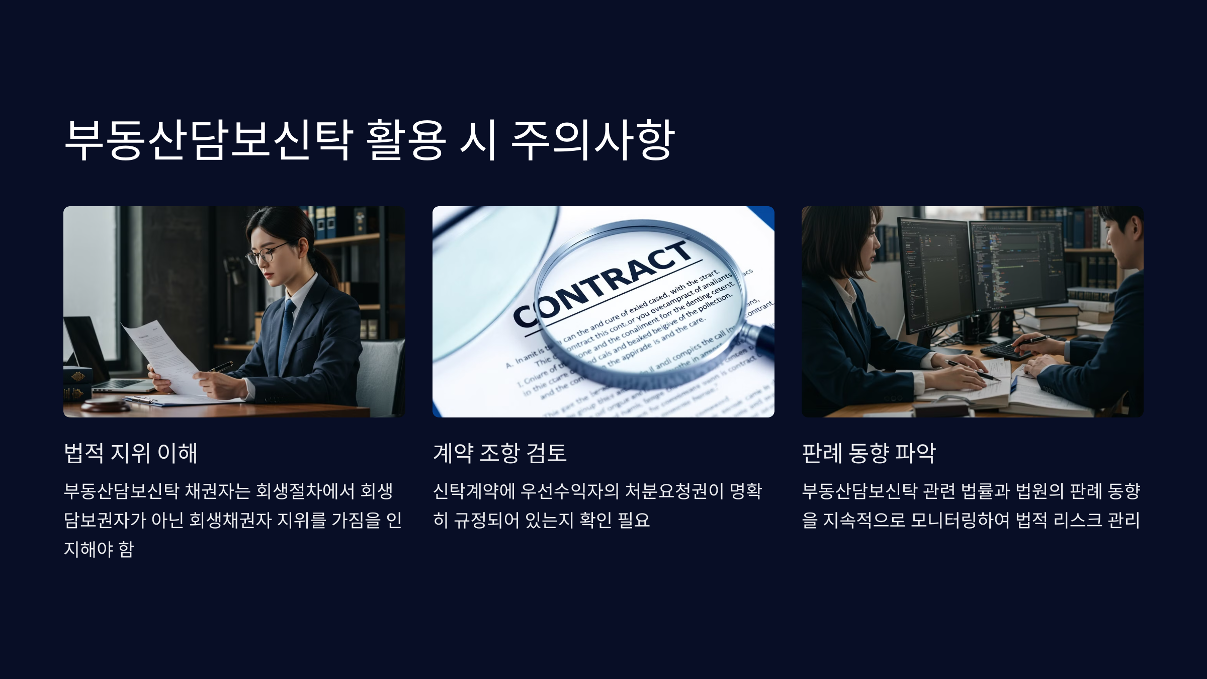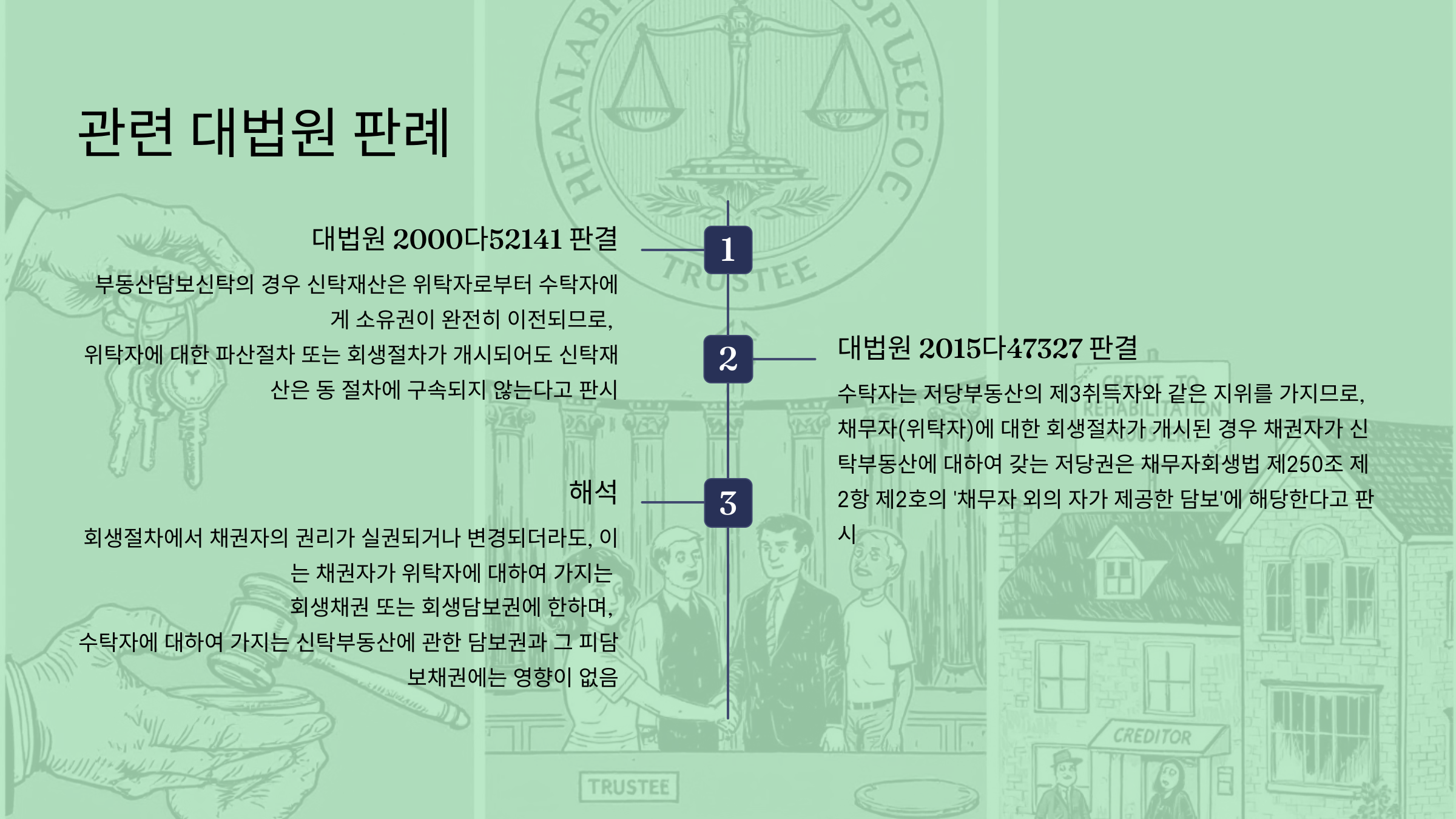 위 대법원 판례들과 학설 등에 따르면, '위탁자(채무자)에 대한 회생절차'에서 ①부동산담보신탁채권자는 회생담보권자가 아닌 회생채권자이다. 그러나, ②부동산담보신탁채권자가 우선수익자의 지위에서 신탁부동산의 공매처분을 청구하여 수탁자가 신탁부동산을 공매처분하여도 채무자(위탁자)에 대한 '채무자회생법상 보전처분'의 효력은 이에 미치지 않고(신탁부동산은 수탁자의 소유),③나아가 부동산담보신탁채권자가 우선수익자의 지위에서 신탁부동산의 공매처분을 청구하여 수탁자가 신탁부동산을 공매처분하는 것이 '채무자회생법상 포괄적 금지명령이나 중지명령'을 위반하는 것도 아니다.
