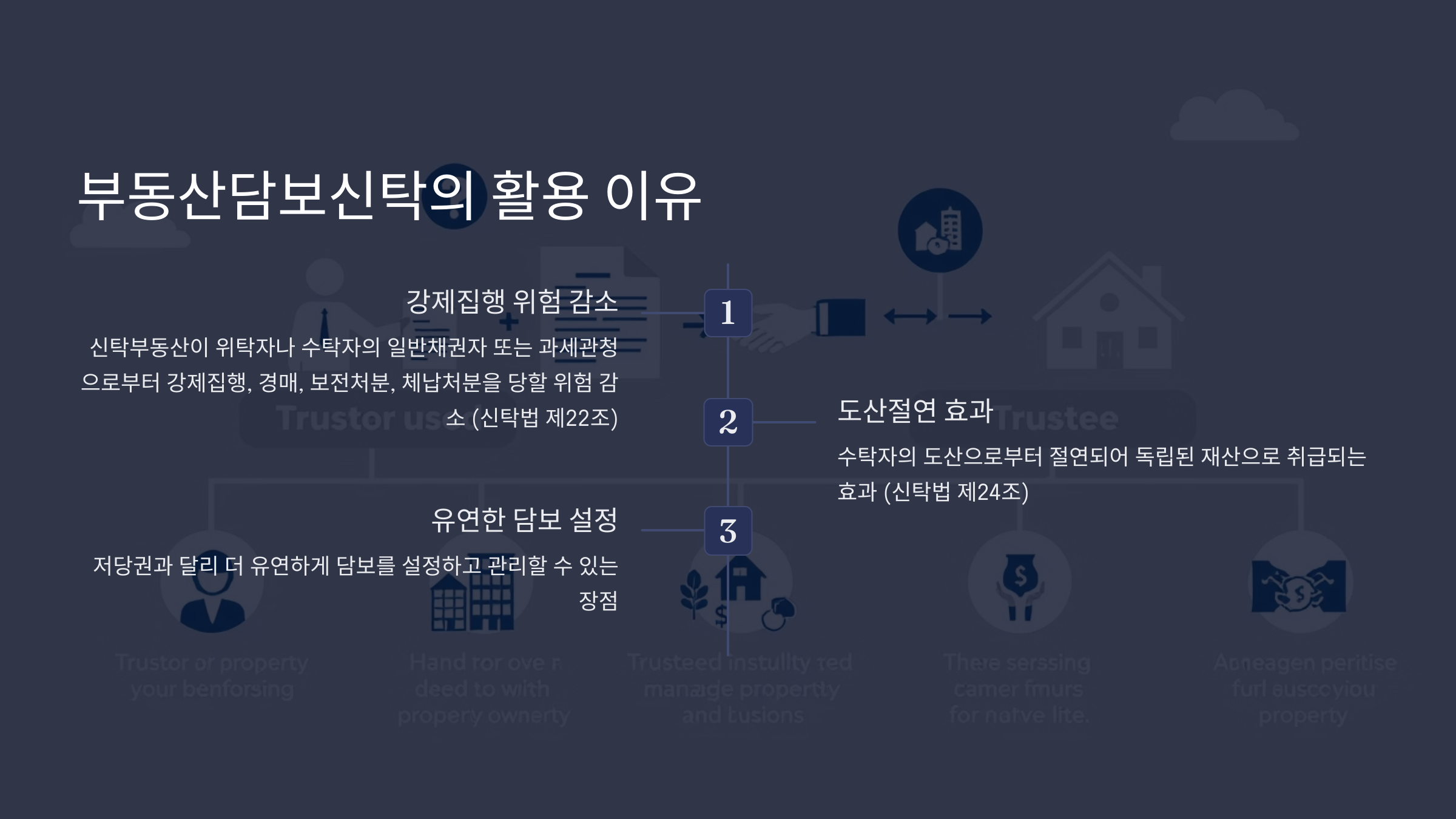 이러한 부동산담보신탁이 활용되는 이유는 여러가지가 있지만 ①부동산담보신탁의 경우 신탁부동산이 위탁자나 수탁자의 일반채권자 또는 과세관청 등으로부터 강제집행을 당하거나 경매·보전처분·체납처분을 당할 위험을 줄일 수 있다는 점(신탁법 제22조), ②부동산담보신탁의 경우 저당권과 달리 수탁자의 도산으로부터 절연되어 독립된 재산으로 취급되는 '도산절연'의 효과가 있다는 점(신탁법 제24조) 등을 들 수 있다.