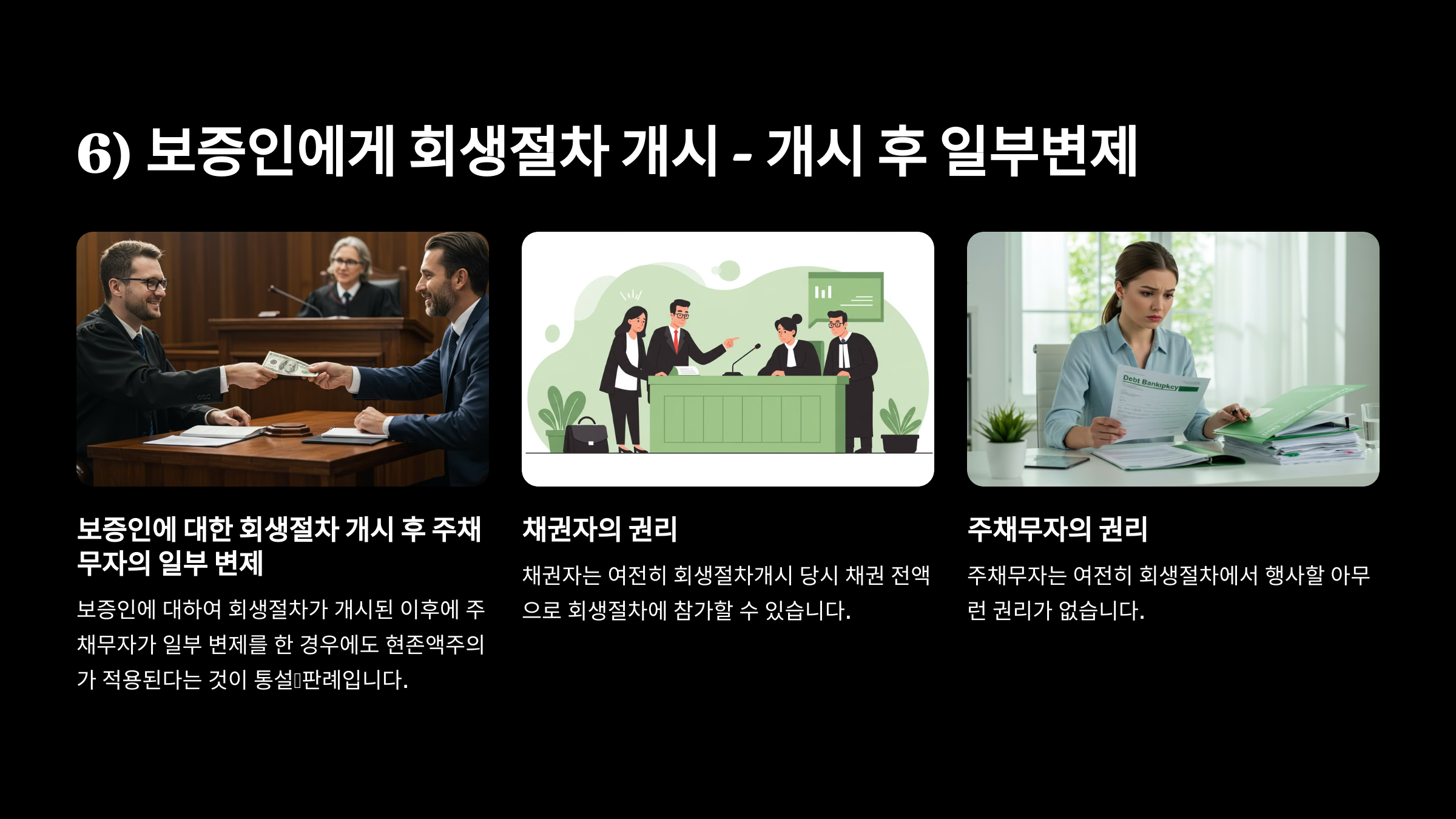 그러나 ②'보증인'에 대하여 '회생절차가 개시된 이후'에 주채무자가 일부 변제를 한 경우에는 이때에도 현존액주의가 적용된다는 것이 통설⋅판례이므로, 채권자는 여전히 회생절차개시 당시 채권 전액으로 회생절차에 참가할 수 있다. 주채무자는 여전히 회생절차에서 행사할 아무런 권리가 없다.