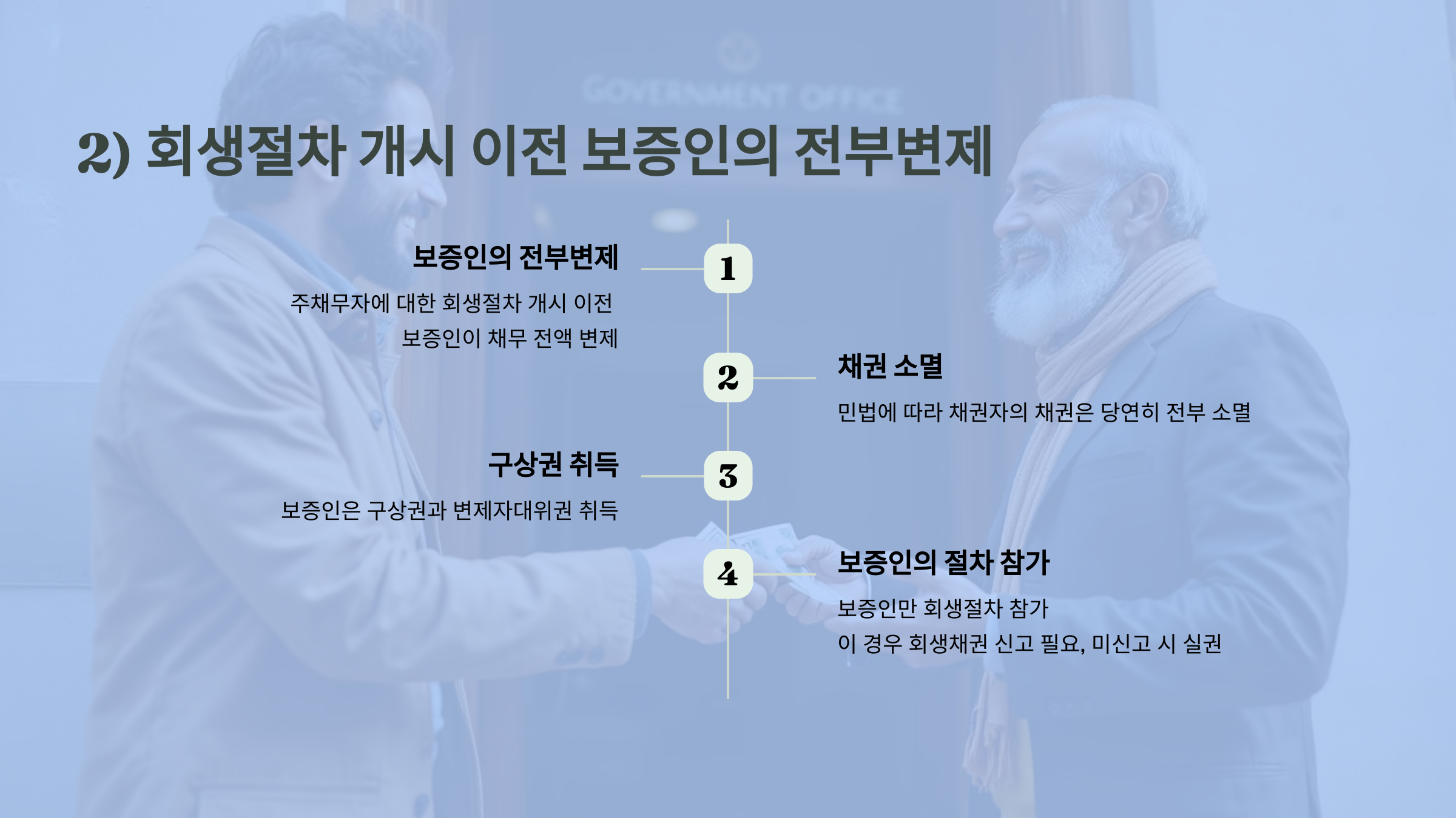 그러므로 '채무자에게 회생절차가 개시'되었을 때, 보증인이 채권자에게 자신의 보증채무를 변제한 이후 자신의 구상권을 채무자의 회생절차에서 주장할 수 있는지 여부는 위의 기준에 따라 잘 살펴보아야 한다.