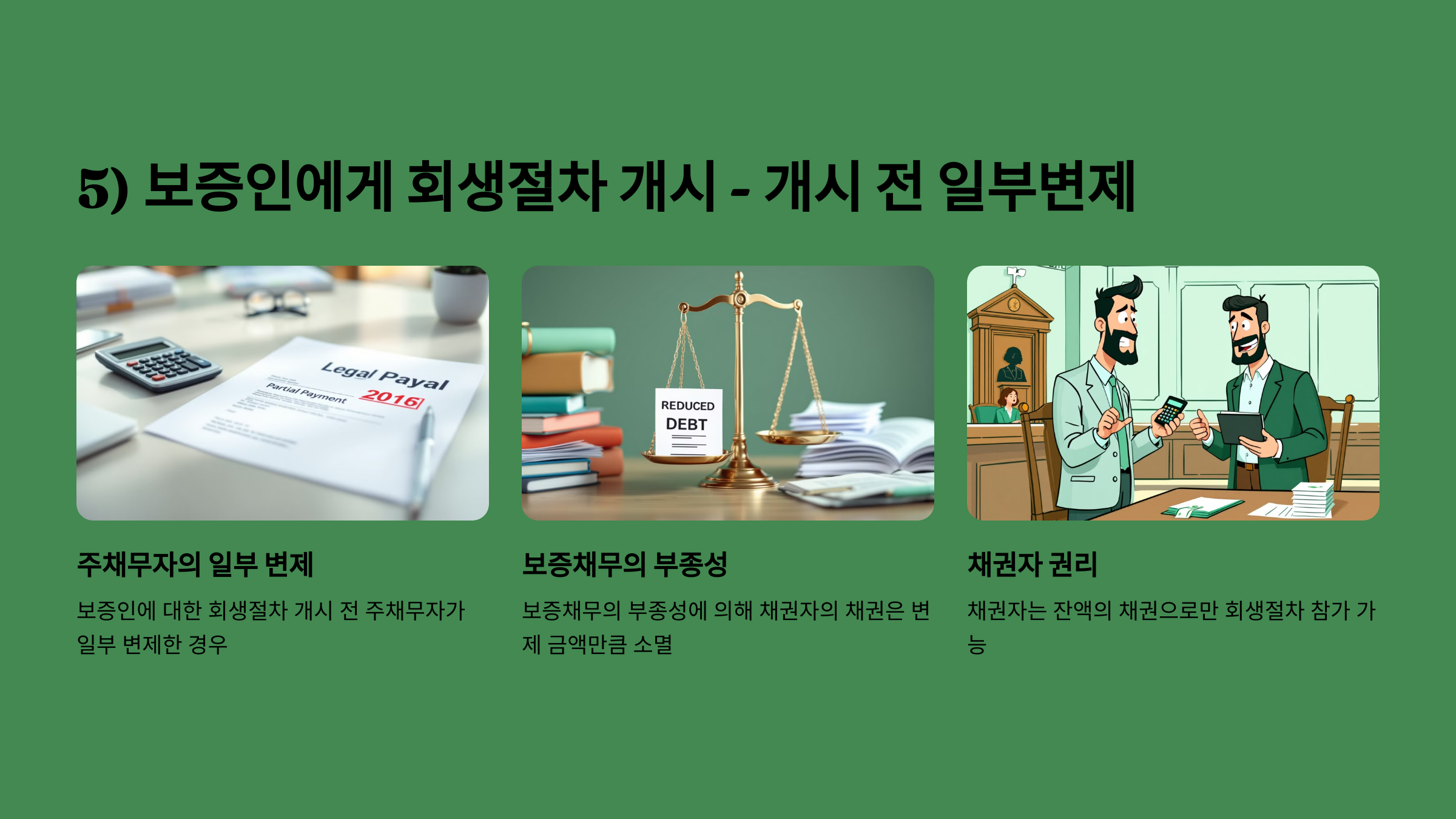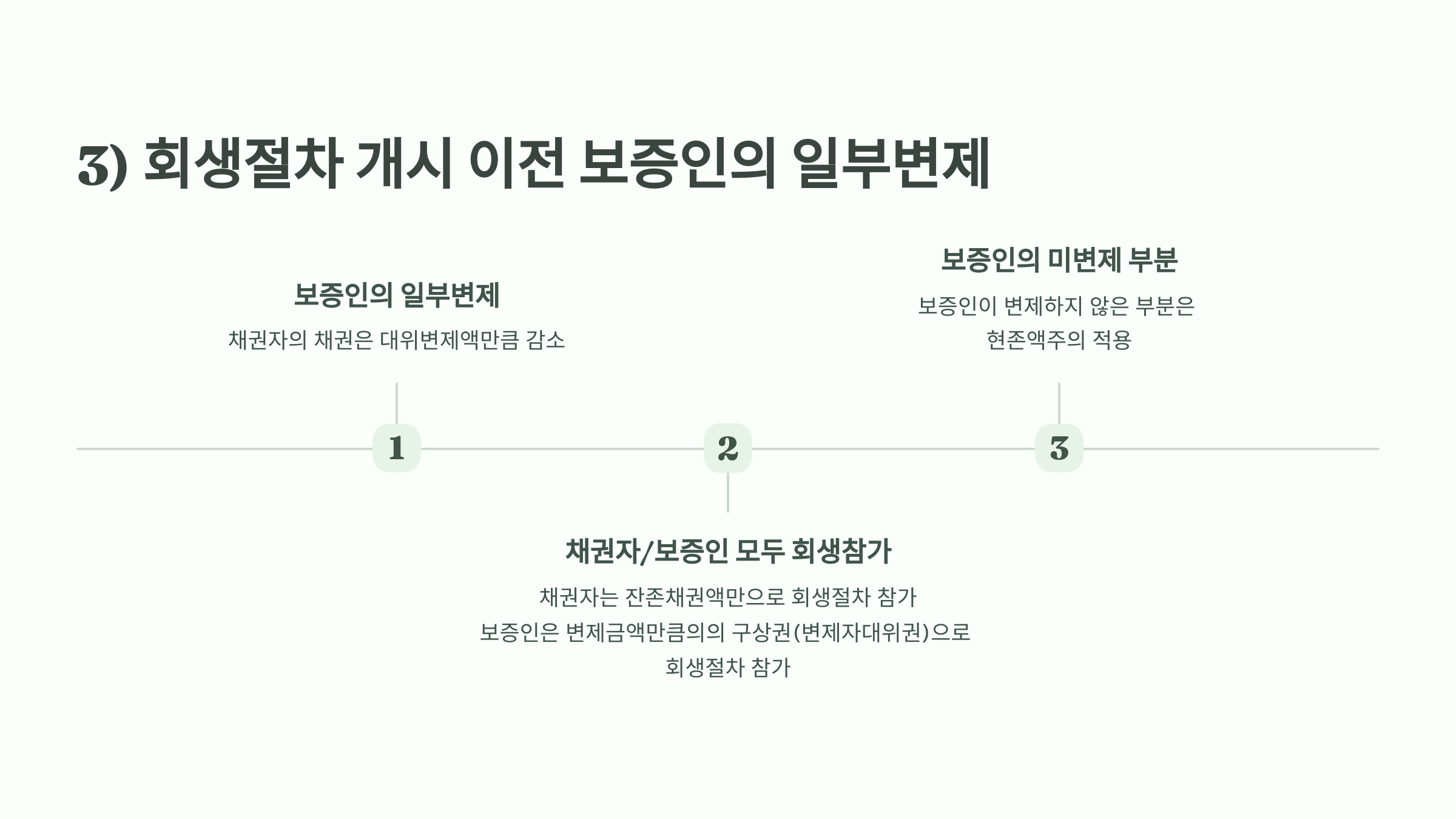 그리고 보증인의 회생절차와 관련하여 주채무자의 일부 변제가 언제 이루어졌는지에 따라 나누어 볼 필요가 있다. ①우선 '회생절차가 개시되기 이전'에 주채무자가 일부 변제한 경우라면 보증채무의 부종성에 의하여 채권자의 채권은 주채무자가 일부 변제한 금액 상당만큼 소멸하고, 채권자는 그 잔액의 채권으로 회생절차에 참가할 수 있다. 주채무자는 자신의 채무를 변제한 것이므로 회생절차에서 행사할 권리는 없다.