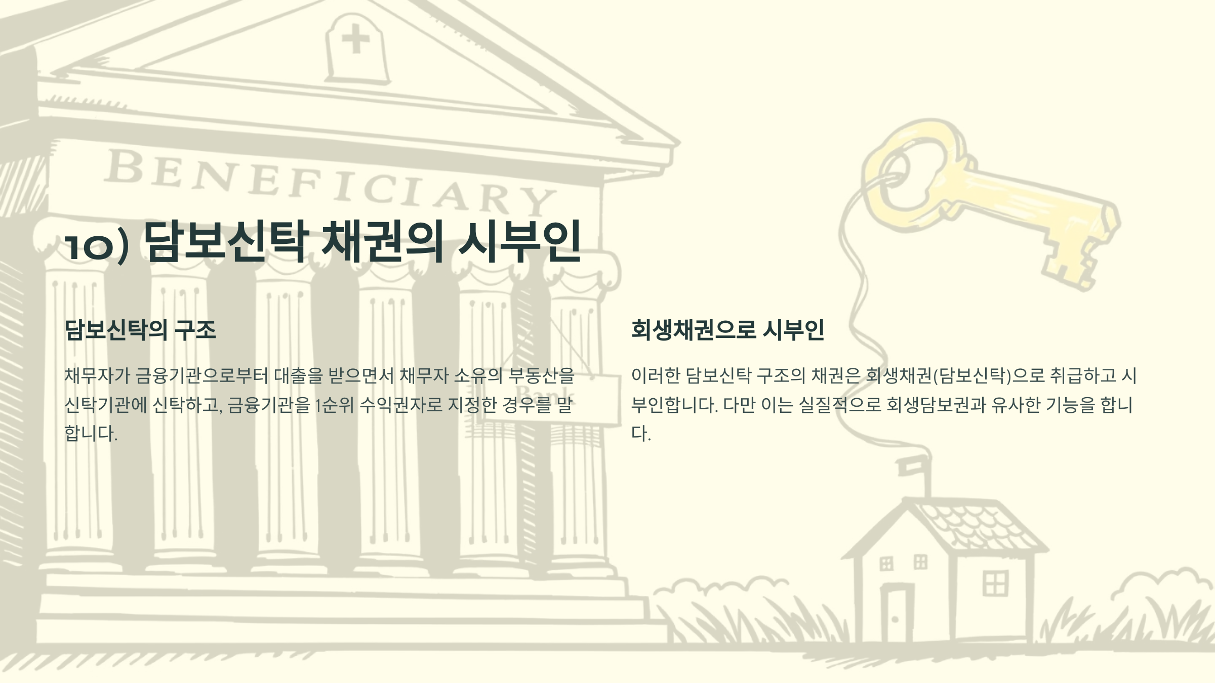 ⑪채무자가 금융기관으로부터 대출을 받으면서 채무자 소유의 부동산을 신탁기관에 신탁하고 금융기관을 1순위 수익권자로 지정한 경우, 회생채권(담보신탁)보아 시부인한다.