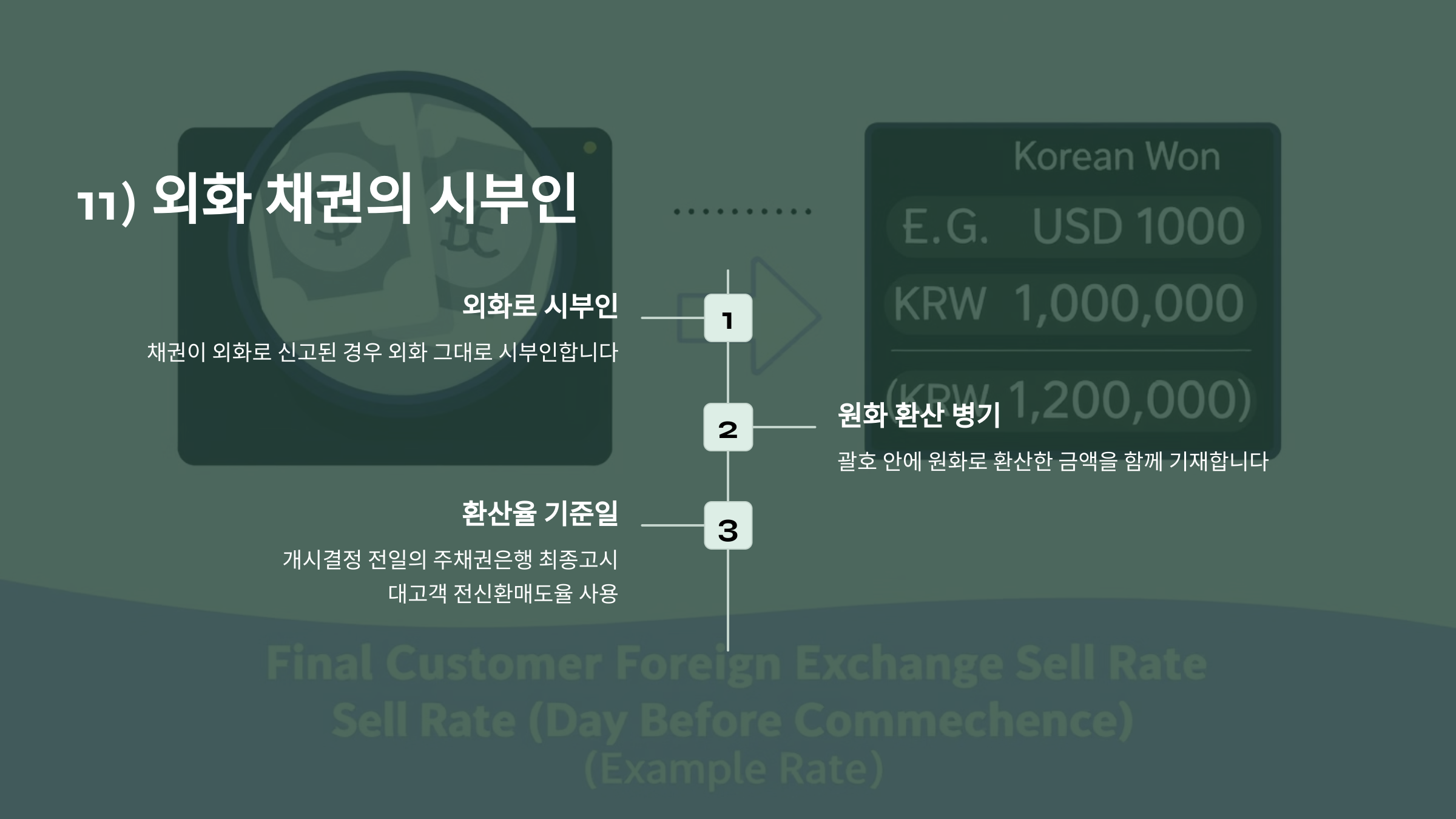⑫채권이 외화로 신고된 경우에는 외화로 시ㆍ부인하되, 괄호 안에 원화로 환산한 금액을 기재한다(원화환산율은 '개시결정 전일'의 주채권은행이 최종고시한 대고객 전신환매도율을 사용).