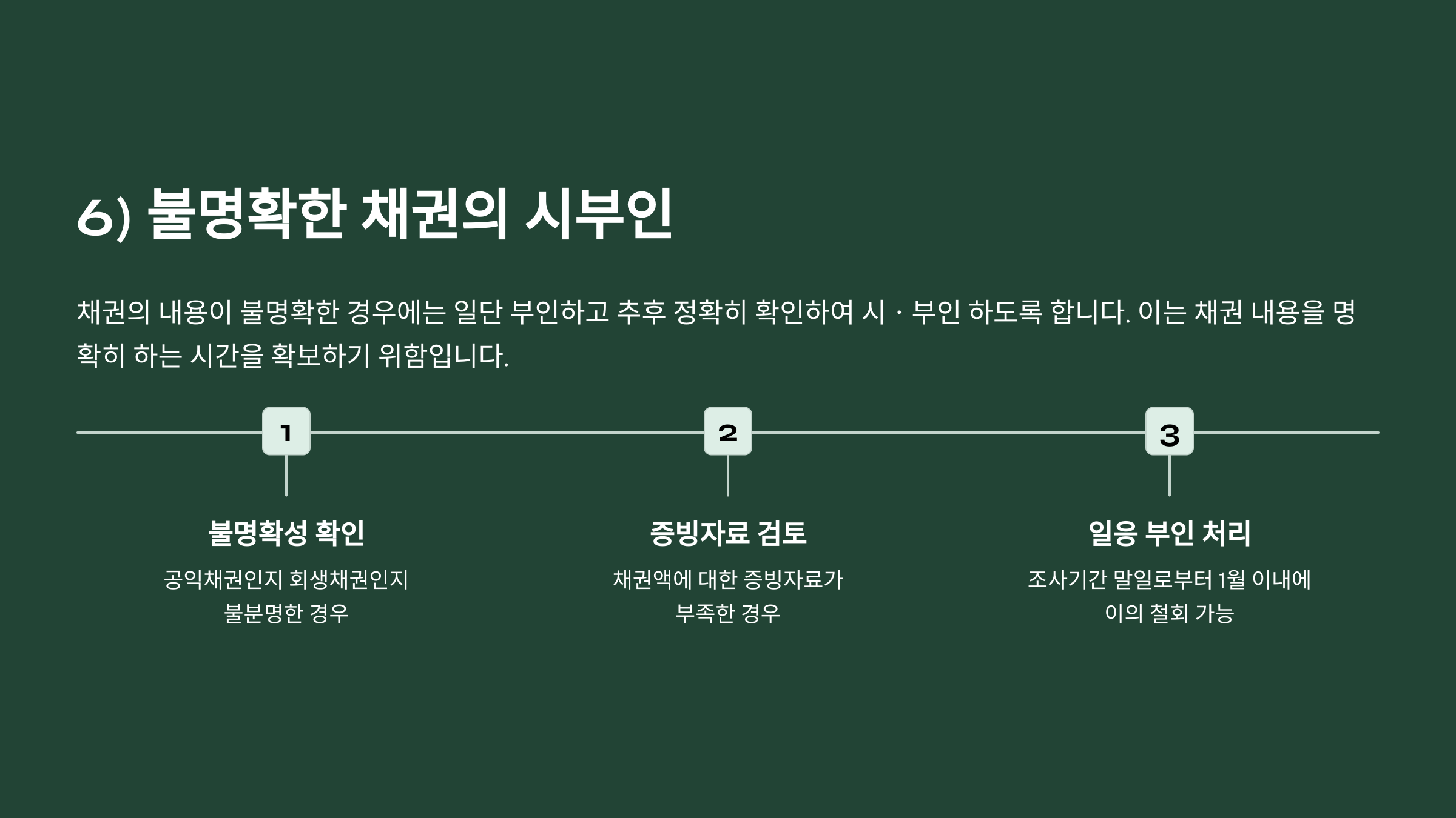 ⑦공익채권인지 회생채권인지 불분명한 경우, 채권액에 대한 증빙자료가 부족하여 채권액을 확정하기 어려운 경우 등 채권의 내용이 불명확한 경우에는 조사기간 말일로부터 1월 이내에 이의 철회할 수 있으므로 일응 부인하고 추후 정확히 확인하여 시ㆍ부인 하도록 한다.
