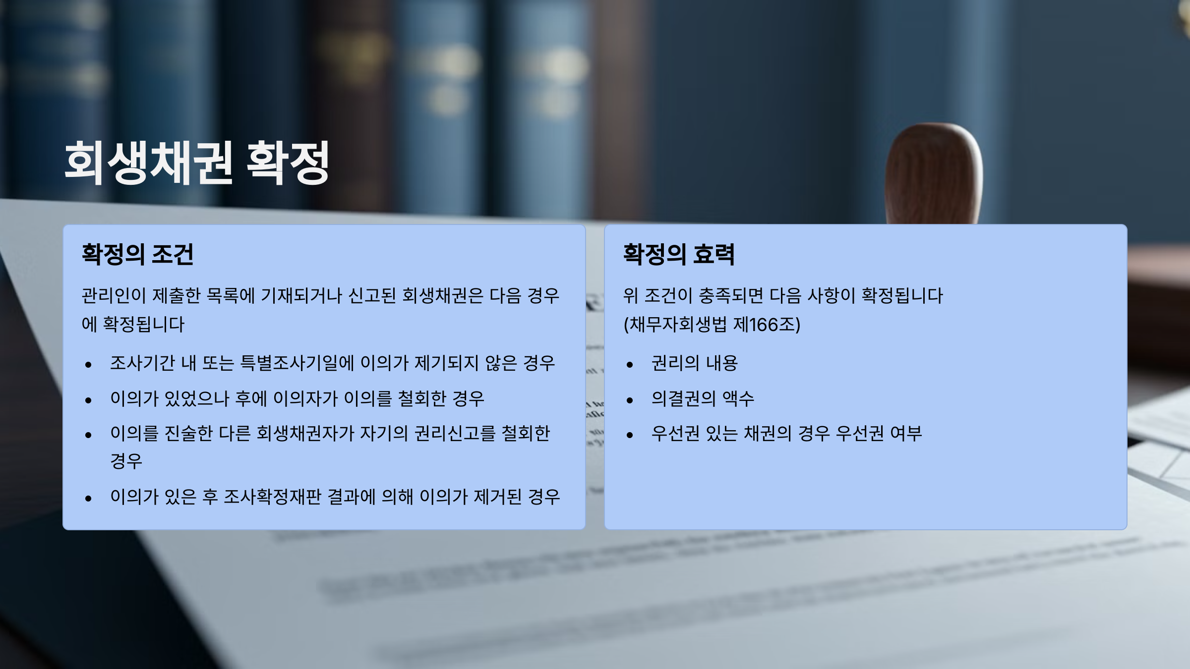 관리인이 제출한 목록에 기재되거나 신고된 회생채권 등은 ①관리인이나 다른 회생채권자·회생담보권자·주주·지분권자로부터 조사기간 내에 또는 특별조사기일에 이의가 제기되지 않은 경우, ②조사기간 내에 또는 특별조사기일에서 이의가 있었으나 후에 이의자가 이의를 철회한 경우, ③이의를 진술한 다른 회생채권자 등이 자기의 권리신고를 철회한 경우, ④이의가 있은 후에 제기된 회생채권 등의 조사확정재판 및 이에 대한 이의의 소 등의 결과에 의하여 그 이의가 제거된 경우에는 권리의 내용과 의결권의 액수가 확정되고, 우선권 있는 채권에 관하여는 우선권 있는 것이 확정된다(제166조).