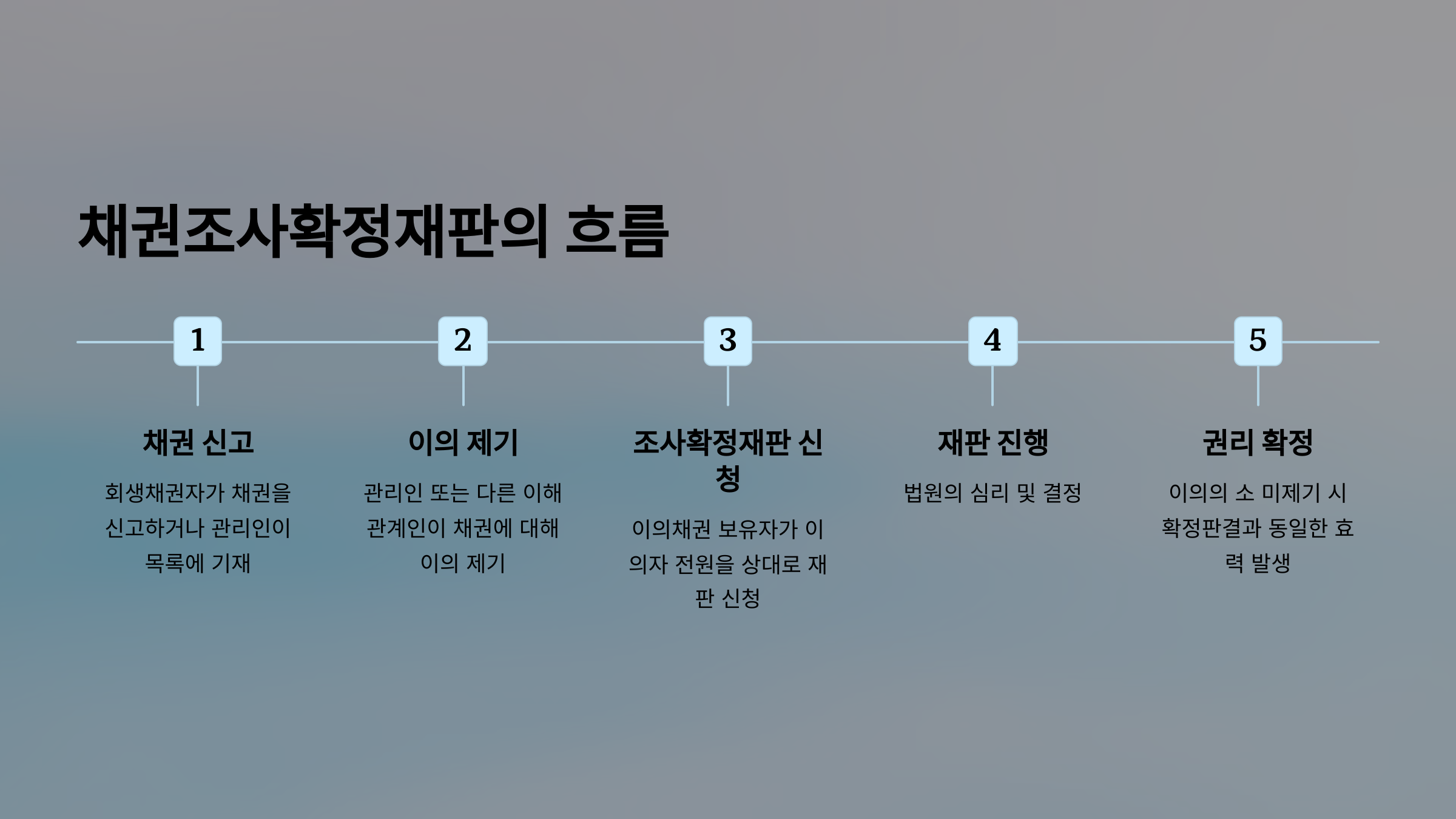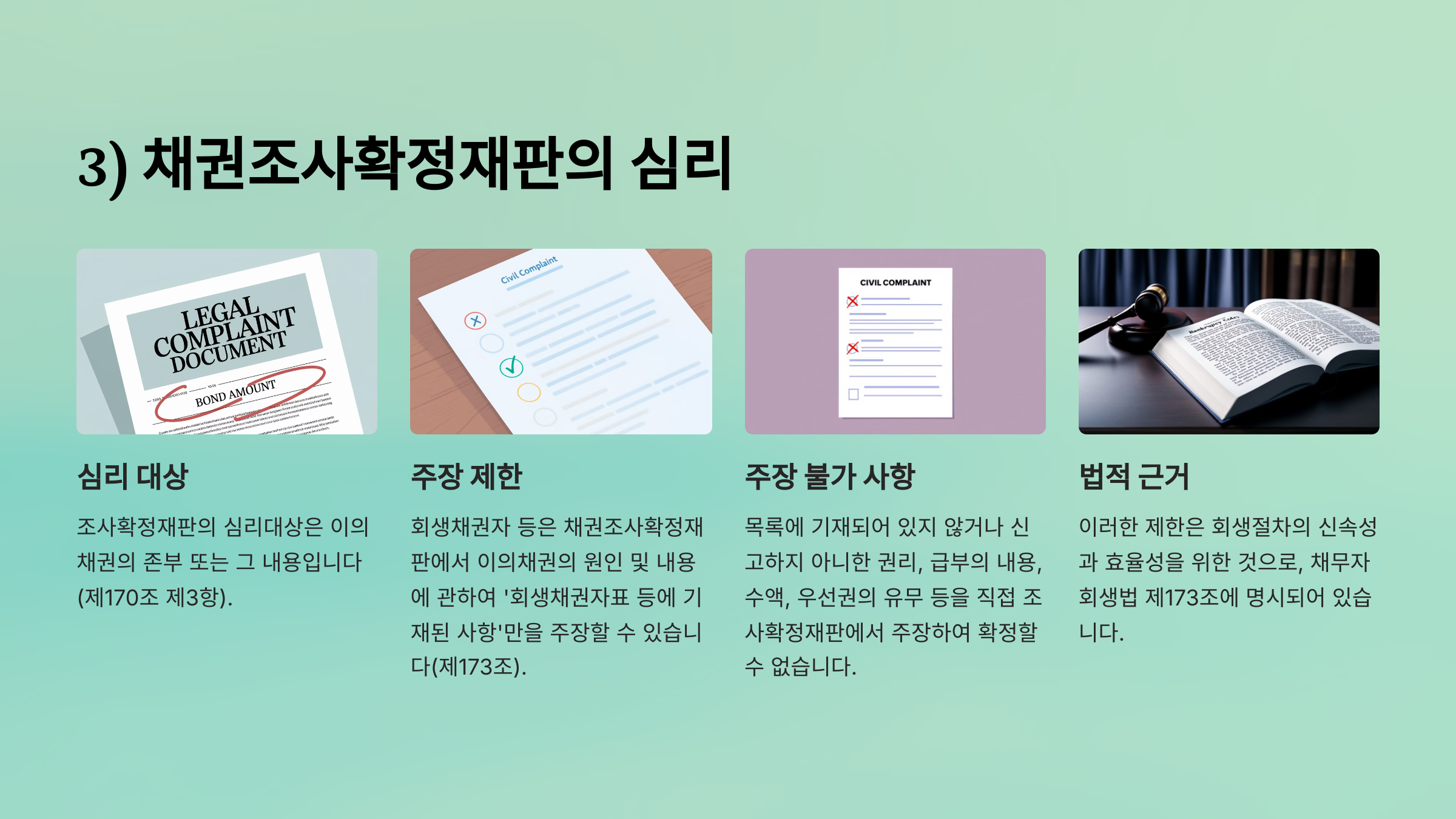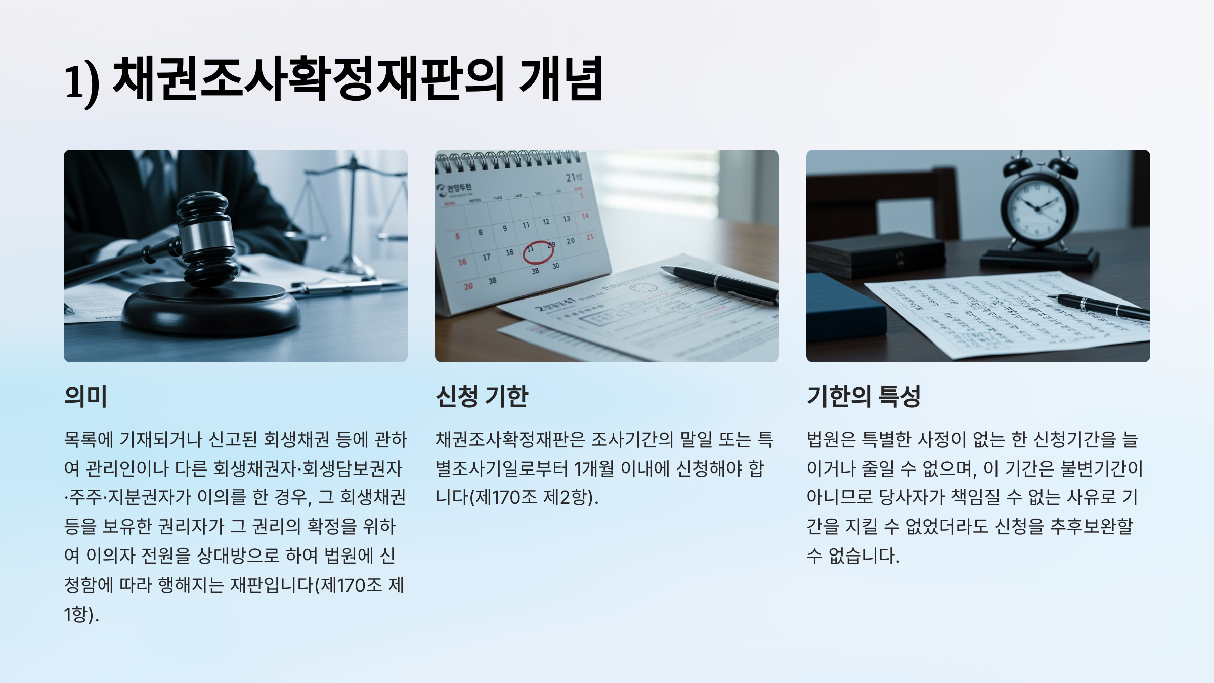 채무자회생법은 목록에 기재되어 있거나 신고된 회생채권 등의 조사는 조사기간을 두어 기일 외에서 조사를 하도록 하고, 이의가 제기된 채권의 존부와 범위에 관하여는 변론절차가 아닌 '간이·신속한 결정절차'인 채권조사확정재판절차를 통하여 확정하도록 하고 있으며, 이에 불복이 있는 경우에 한하여 소송절차인 조사확정재판에 대한 이의의 소에서 다투도록 하고 있다(제171조 제1항).