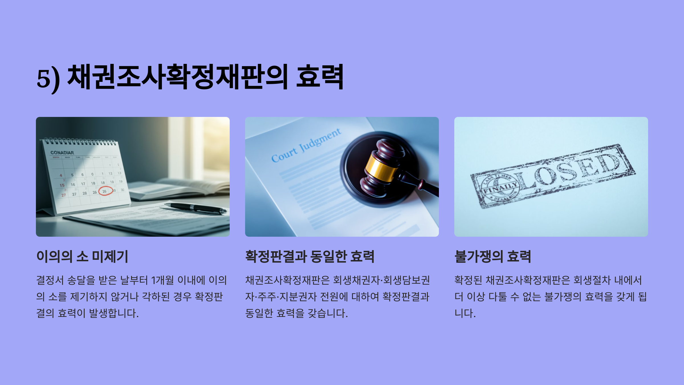 채권조사확정재판에 대한 이의의 소가 그 결정서의 송달을 받은 날부터 1개월 이내에 제기되지 않거나 각하된 때에는 그 재판은 회생채권자·회생담보권자·주주·지분권자 전원에 대하여 확정판결과 동일한 효력이 있다(제176조 제2항). 여기서 ‘확정판결과 동일한 효력’은 회생절차 내에서 불가쟁의 효력이 있다는 의미이다.