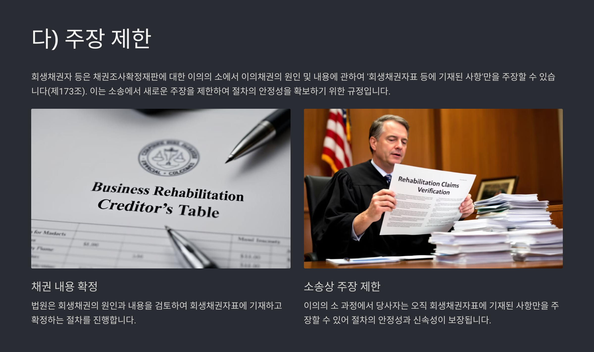 회생채권자 등은 채권조사확정재판에 대한 이의의 소에서 이의채권의 원인 및 내용에 관하여 '회생채권자표 등에 기재된 사항'만을 주장할 수 있다(제173조).