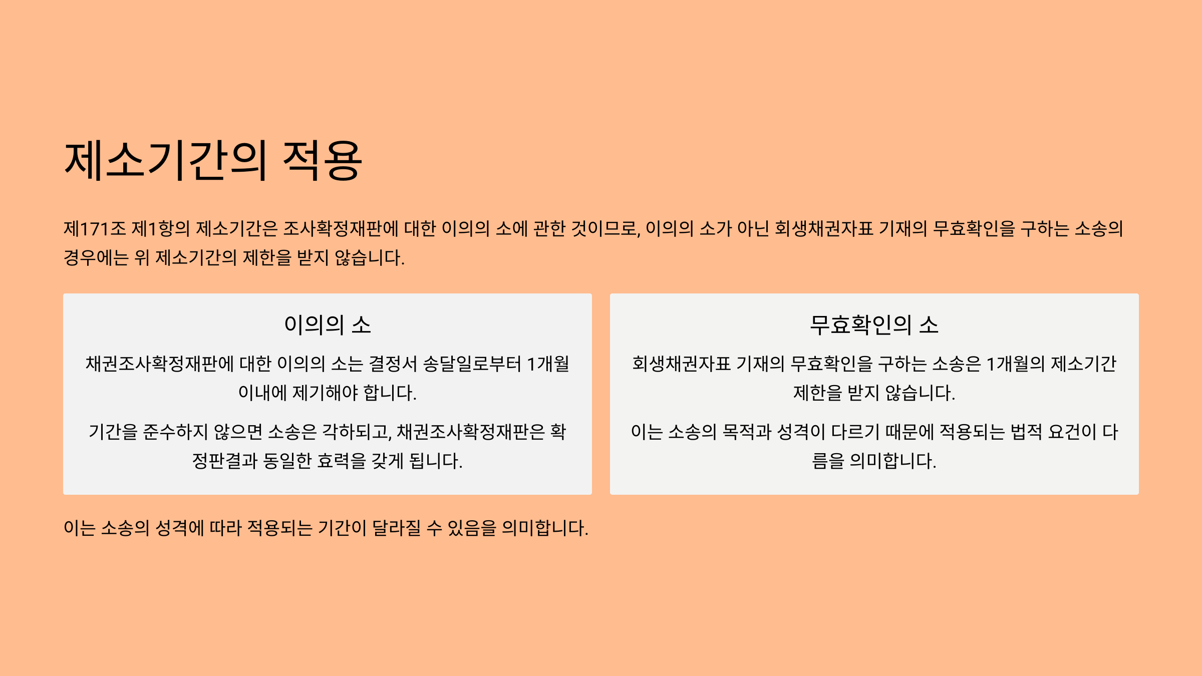 이의의 소가 각하된 경우, 채권조사확정재판은 회생채권자 등 전원에 대하여 확정판결과 동일한 효력이 있다(제176조 제2항). 제171조 제1항의 제소기간은 조사확정재판에 대한 이의의 소에 관한 것이므로, 이의의 소가 아닌 회생채권자표 기재의 무효확인을 구하는 소송의 경우에는 위 제소기간의 제한을 받지 않는다.
